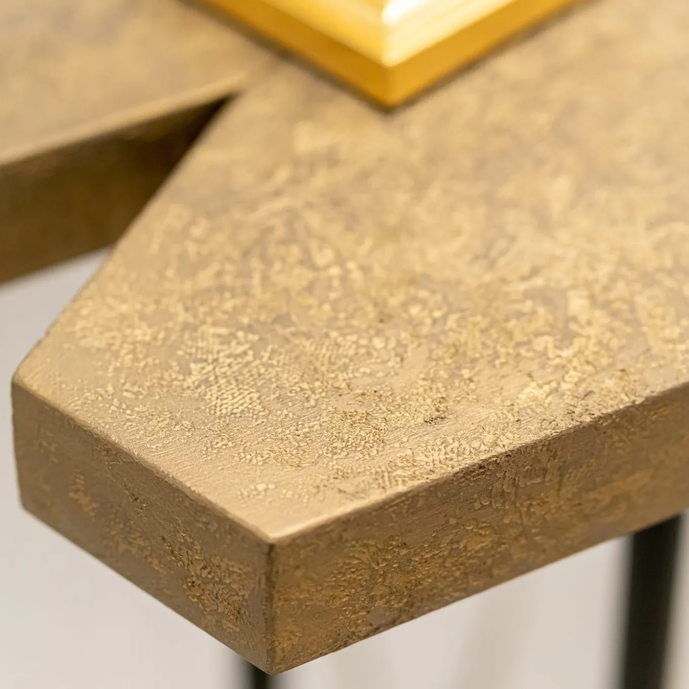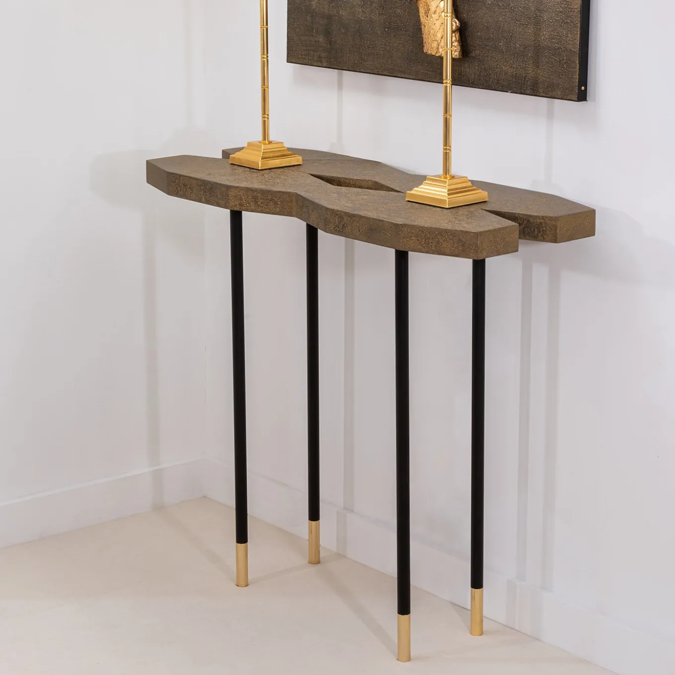 A sleek and sophisticated design of iconic contemporary aesthetic, this console features a striking X-shaped wooden top finished with gauze and an antiquated gold leaf coating, matching the shiny 18K gold-plated brass feet and in elegant contrast with the black shade of the lacquered metal legs. Please consult the Concierge for more information.