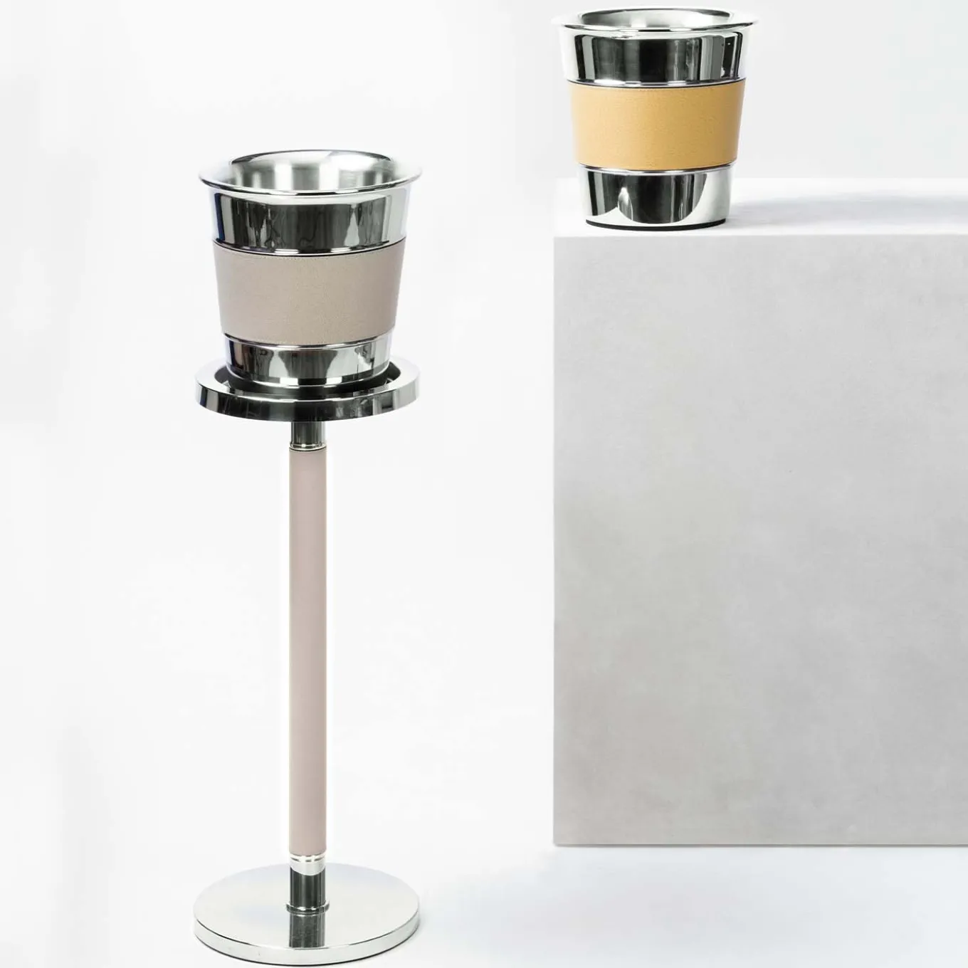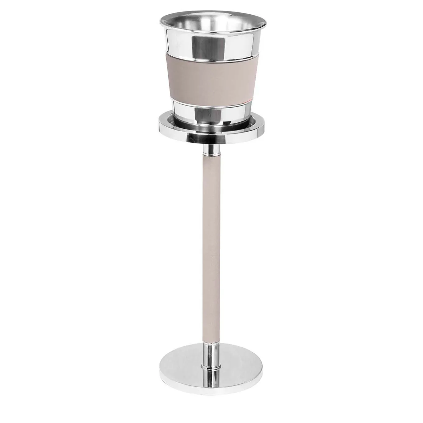 Stainless steel structure with a heavy solid base and leather-covered central column. Sold in combination with our Ocean champagne bucket (TT069), but also able to host any other model with a maximum lower diameter of 20 cm. Please contact Concierge for more options.