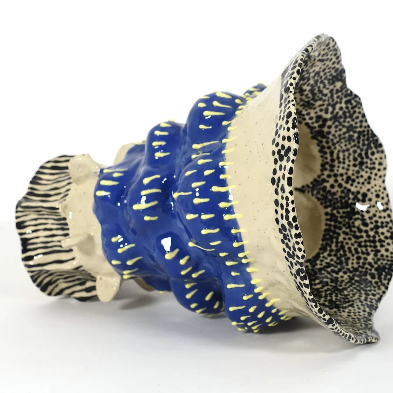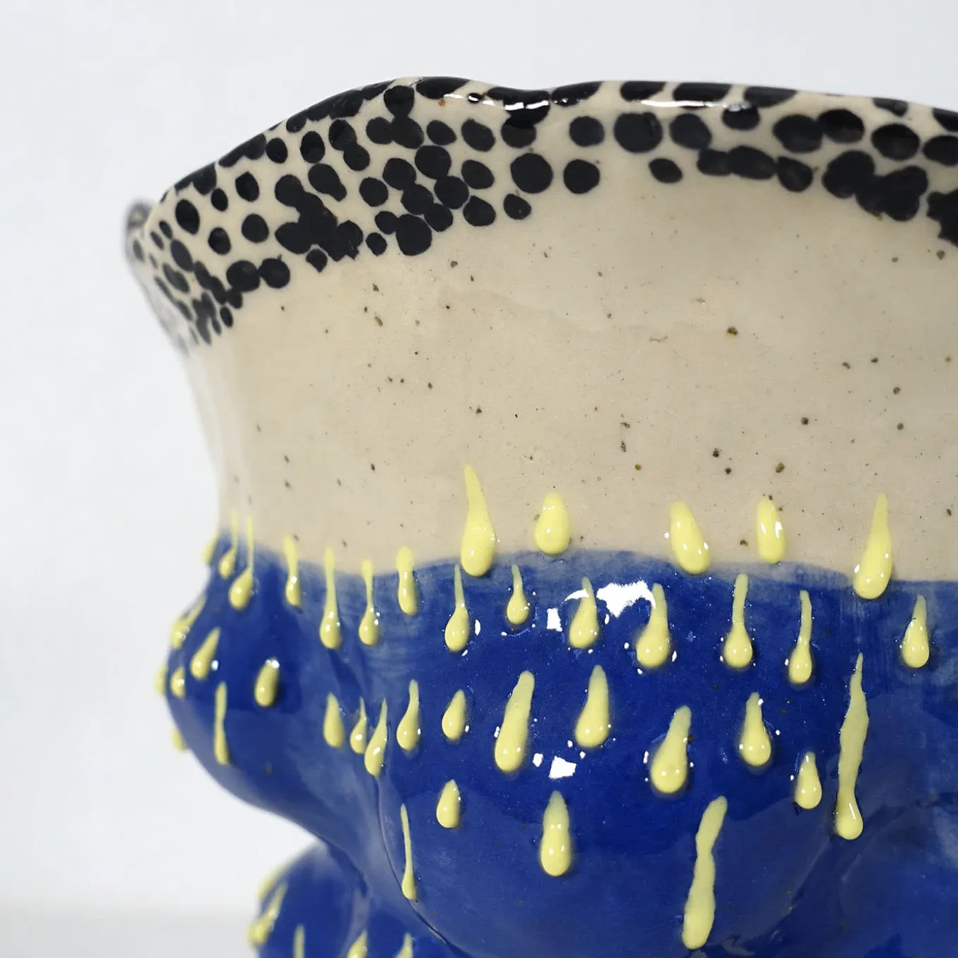 A magnificent display of the traditional art of ceramic rendered in a sophisticated contemporary flair, this vase is deftly crafted by hand of porcelain stoneware, decorated with blue and black glazes. Stunning in its bulging texture, it is enhanced with drops of yellow-lacquered porcelain and clear enamel. Due to its handcrafted nature, it may display small imperfections that are a testament to the vase’s uniqueness and authenticity.