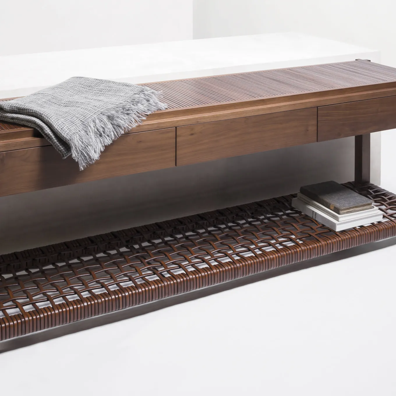 Soft and rigorous lines interact with each other to create this exclusive design by Stéphane Parmentier for Giobagnara. The sober rectangular top is supported by long, slender legs with an L-shaped cross-section, while that base is embellished with a shelf of interlaced brown leather strips, the distinctive feature of the Structura Collection. Also available in a wengé finish with black leather, please contact the Concierge.