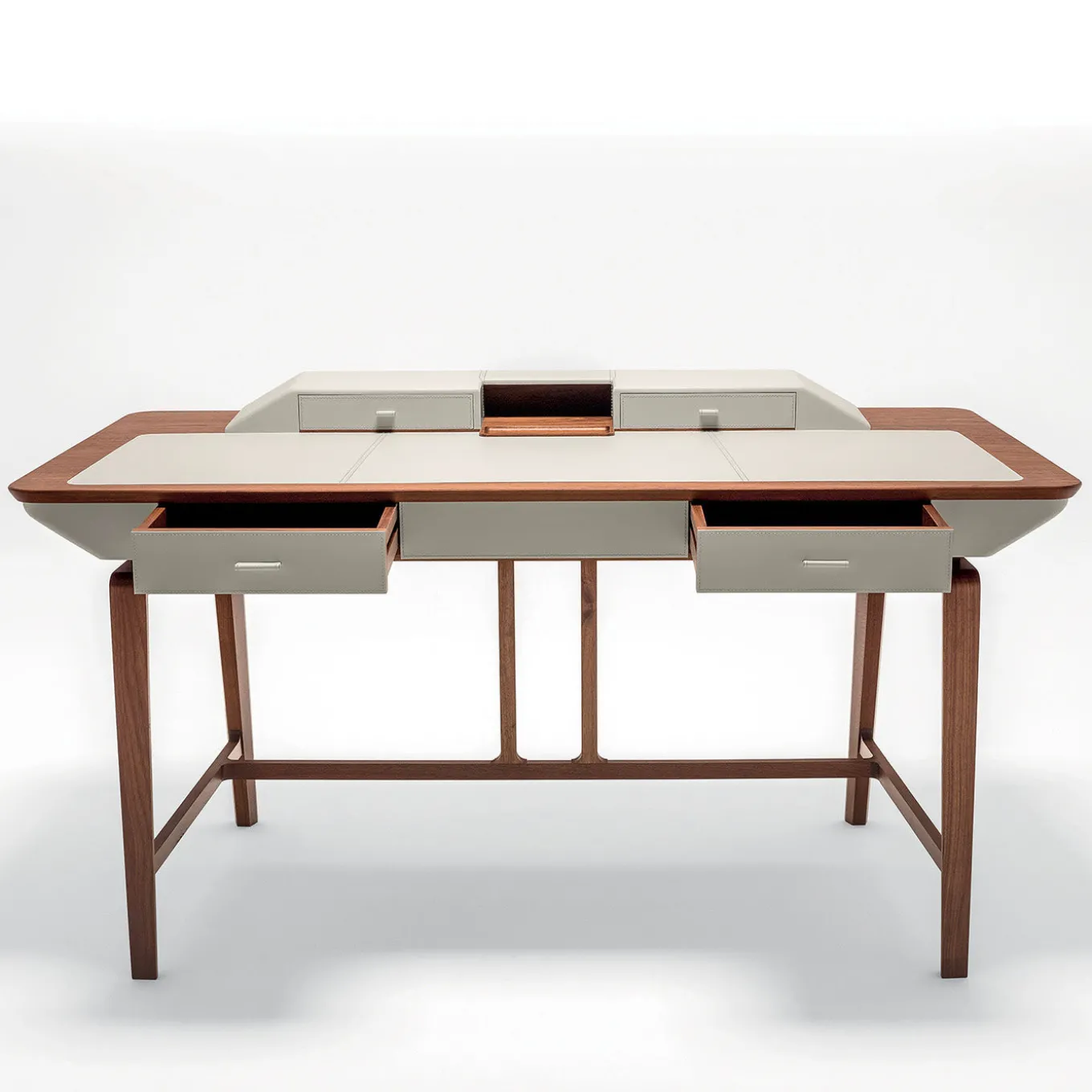 Marked by a futuristic-inspired design, this writing desk features striking lines of impressive visual allure. Handmade of veneered solid Canaletto walnut wood, it is enriched with two drawers and two smaller ones on the top, all four covered with leather, customizable in a wide variety of hues, please contact the Concierge for details.