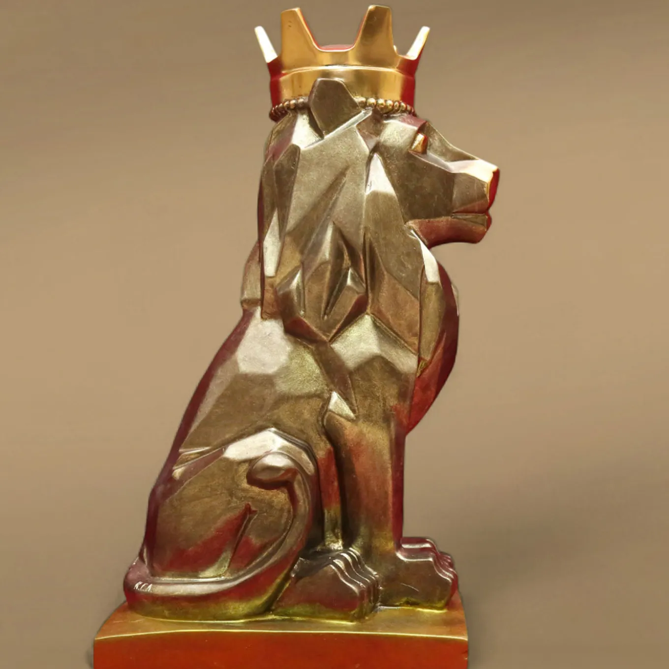 With its regal pose and modern faceted silhouette, this stylized lion is completely handcrafted with traditional casting techniques in dazzling brushed brass and rests on an elegant plexiglass base. This understatedly elegant statuette will embellish a modern or classic interior with its warm golden intensity. The piece measures 16x22x33cm.