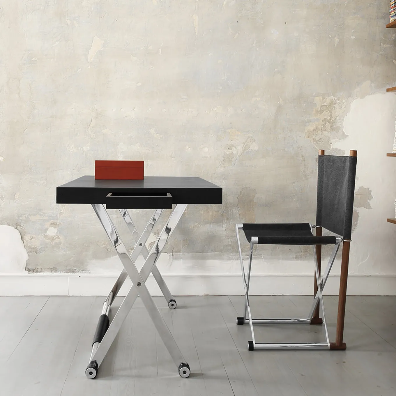 Designed with a modern interior in mind, this luxury desk is foldable and can be a precious and versatile addition to any room. The top in solid wood is covered with frosted black leather, while the four crossing legs are in aluminum, with a leather insert on the bottom element. Other colors are available upon request and the upholstery can also be in full-grain leather.