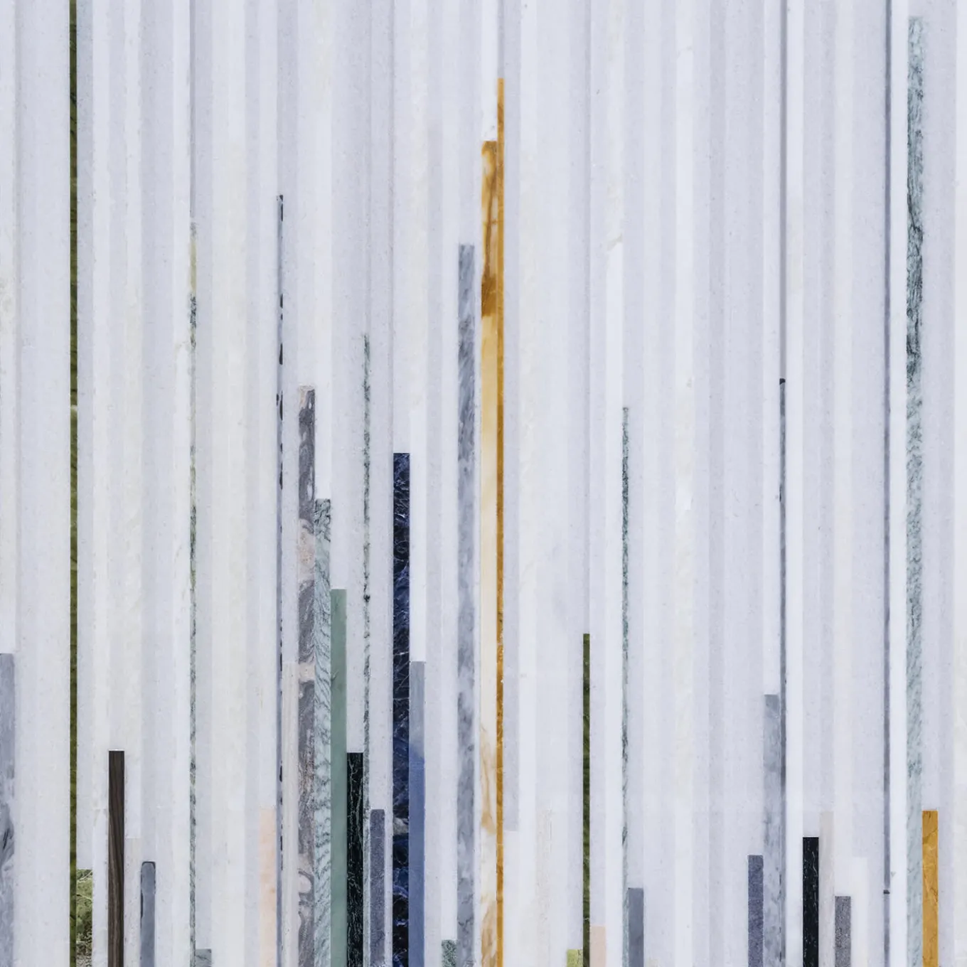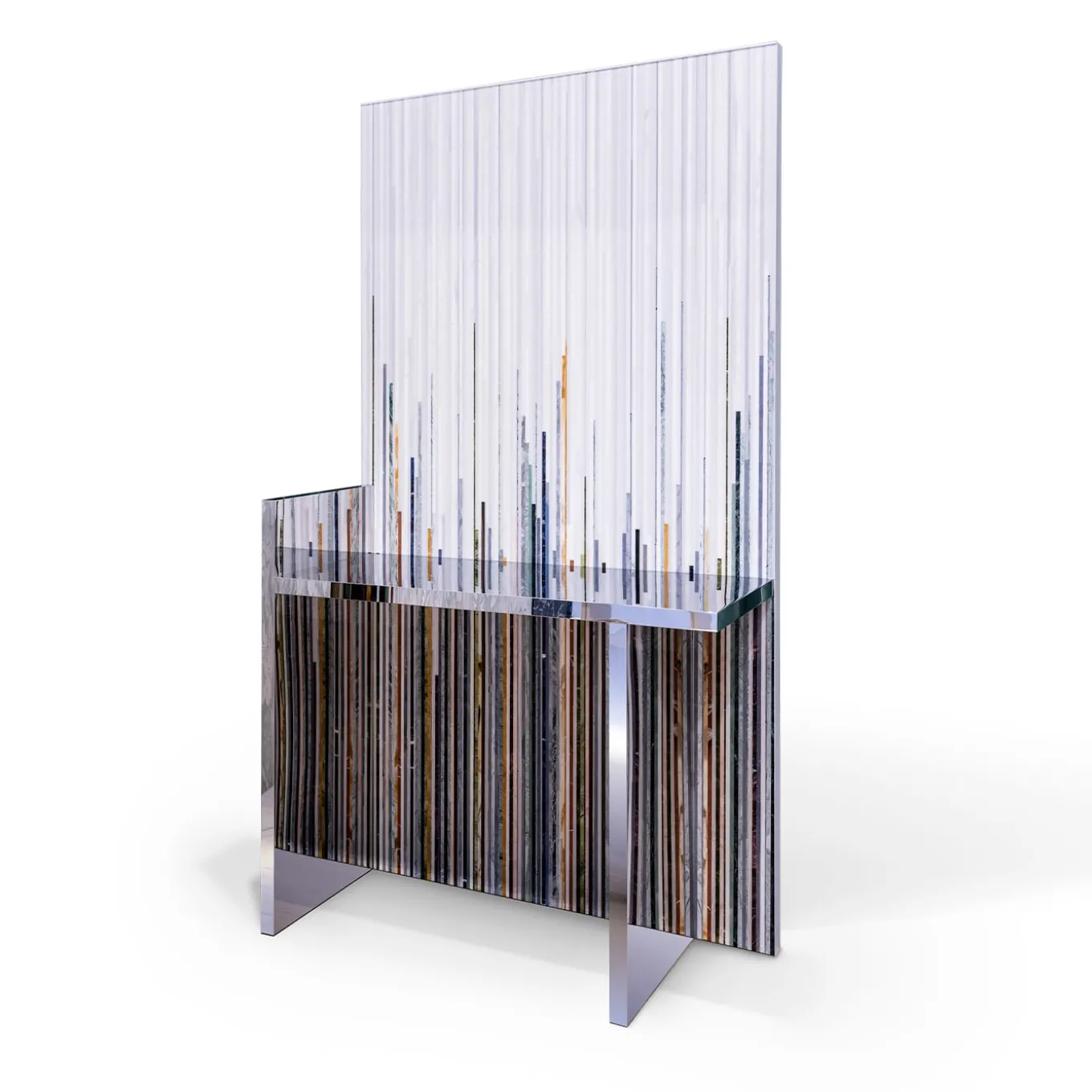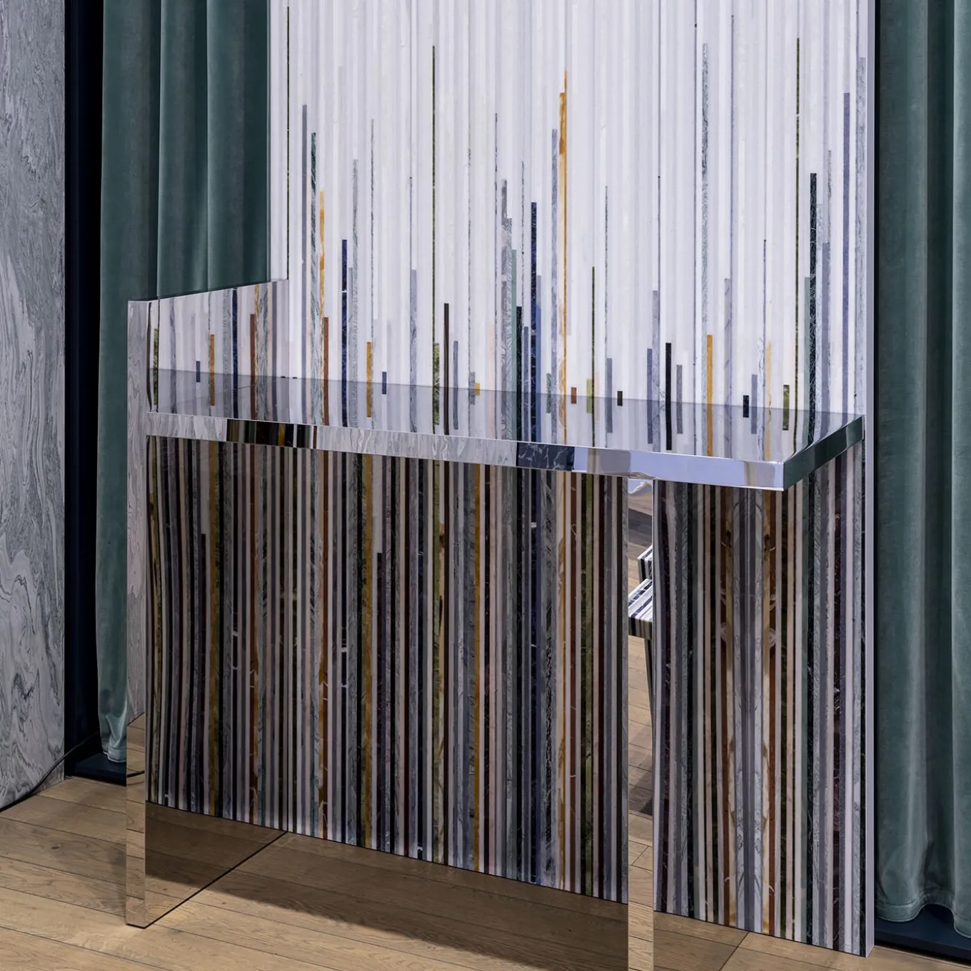 The Subarashi Consolle, from the exclusive Fragment Collection by Gwenael Nicolas for Budri – unveiled at the Milan Design Week 2022, with a strong scenic impact, is one of a kind: it is composed of a self-standing cladding made of polychrome marble rods. Like a fabric, the vertical surface fades from white marbles to a free fall of color stripes at the bottom. The pattern made of precious materials, including the Sodalite, is reflected onto the mirror console top.