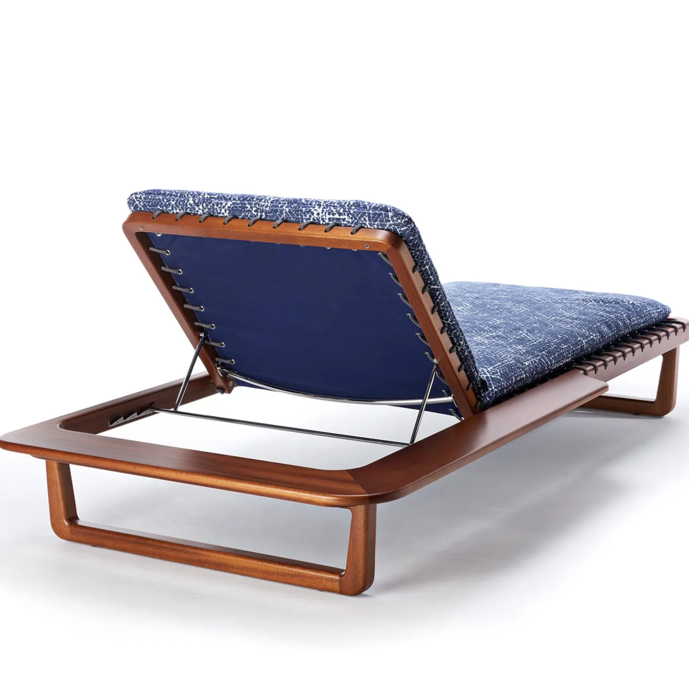 A stupendous design rich in details, this sun lounger by Paola Navone is deftly handcrafted of first-rate materials. In its sleek and refined silhouette, the precious mahogany structure is enriched with two cushions softly padded and covered with a blue patterned fabric. An outdoor cover is recommended to protect the piece when left outside, please contact the Concierge for details. Customizable upon request to suit any decor need or taste. If the products are placed completely outside, nightcovers that can be purchased at an extra price are recommended. Please contact the Concierge for further information and options.