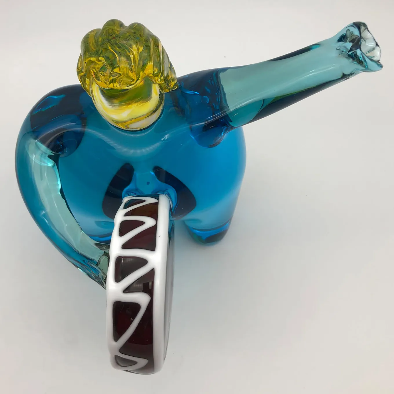 A deft showcase of craftsmanship, this exceptional small sculpture belongs to a refined series of designs uniquely handmade by Ars Murano. Defined by a transparent aquamarine color, it depicts a drum player distinguished by a clear yellow head, holding a brown and white drum. Effortlessly elevating any decor, it will be a creative housewarming gift for friends or loved ones.