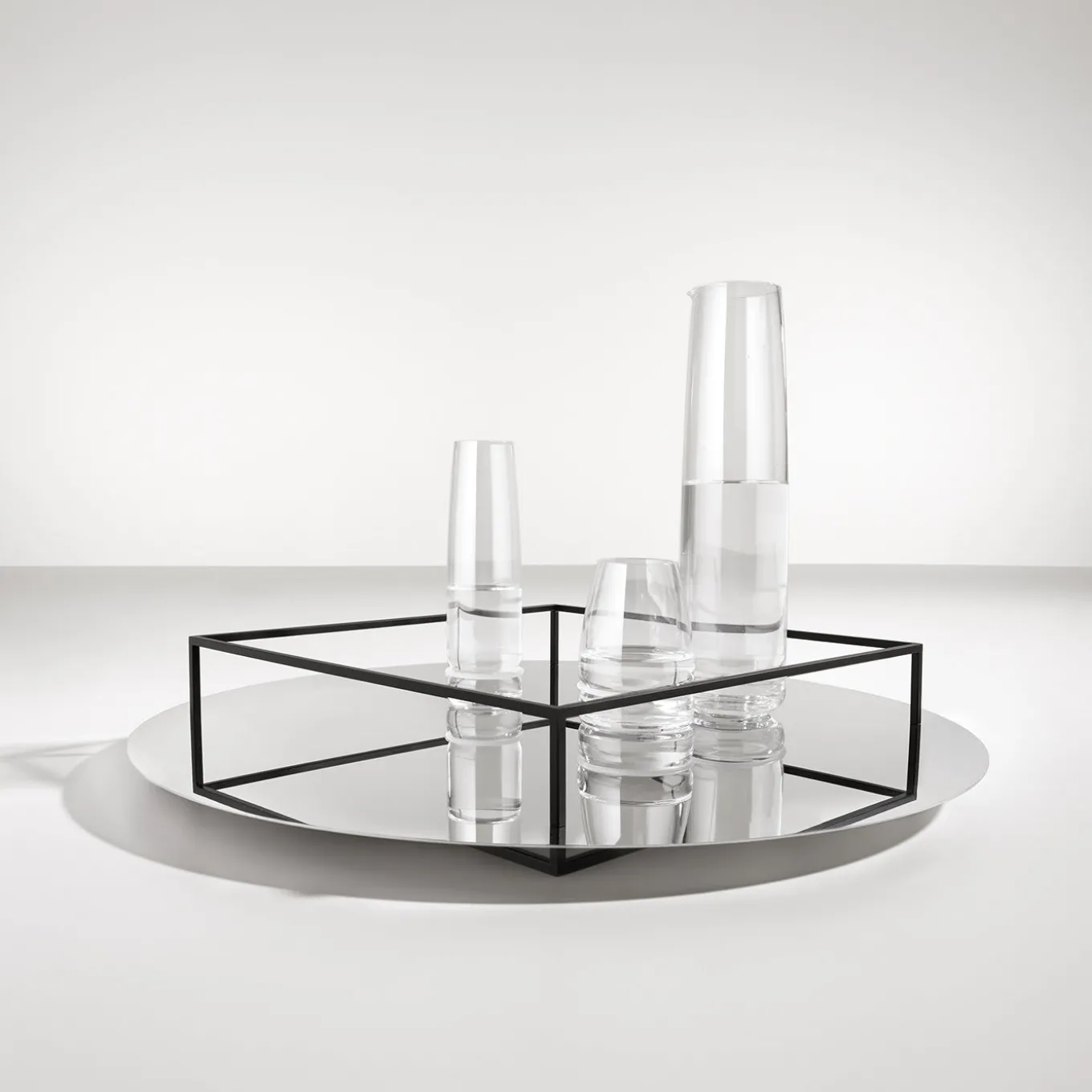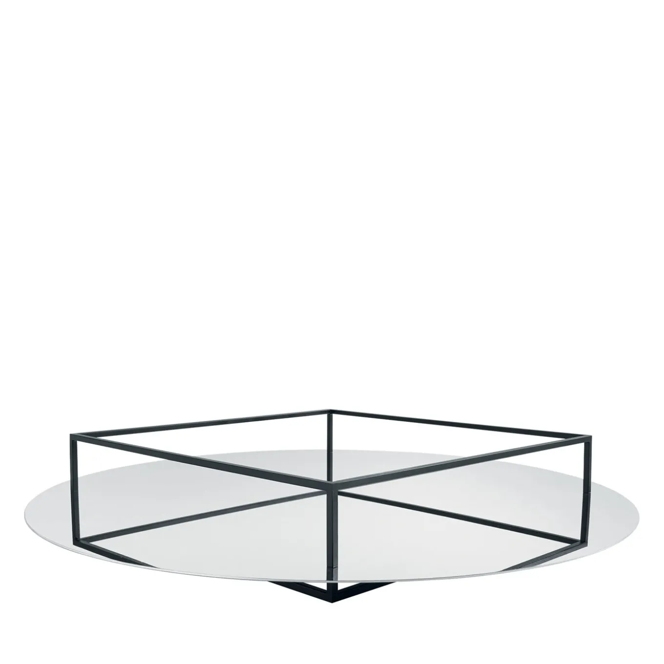 An eye-catching interplay of reflections and deceptive volumes makes this fruit tray a true gem of functional decor. Resting on a round base in mirrored glass, a streamlined, fence-like structure in black-lacquered metal traces the square aerea dedicated to the collection of fruits. This precious design is designed and executed by Ron Gilad.