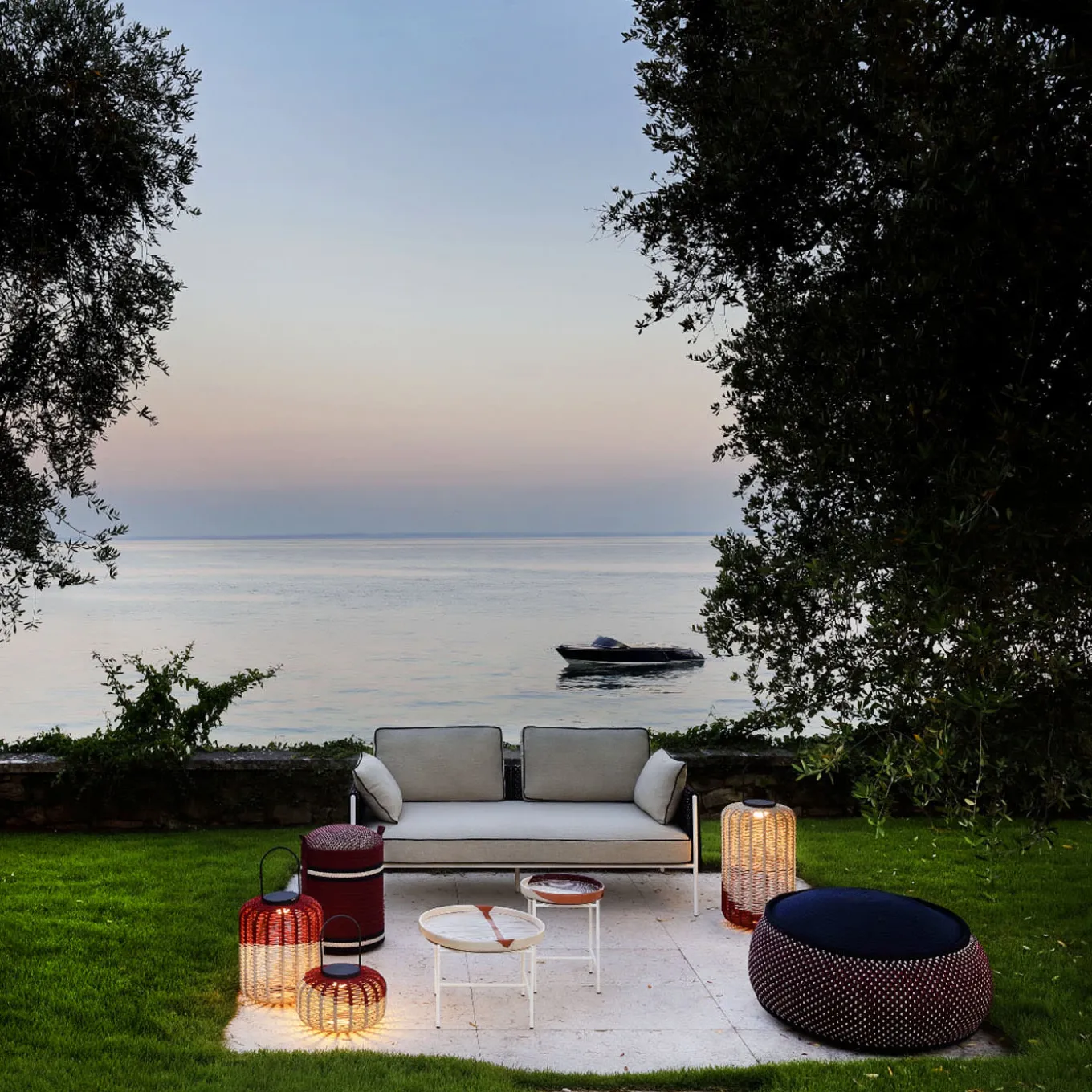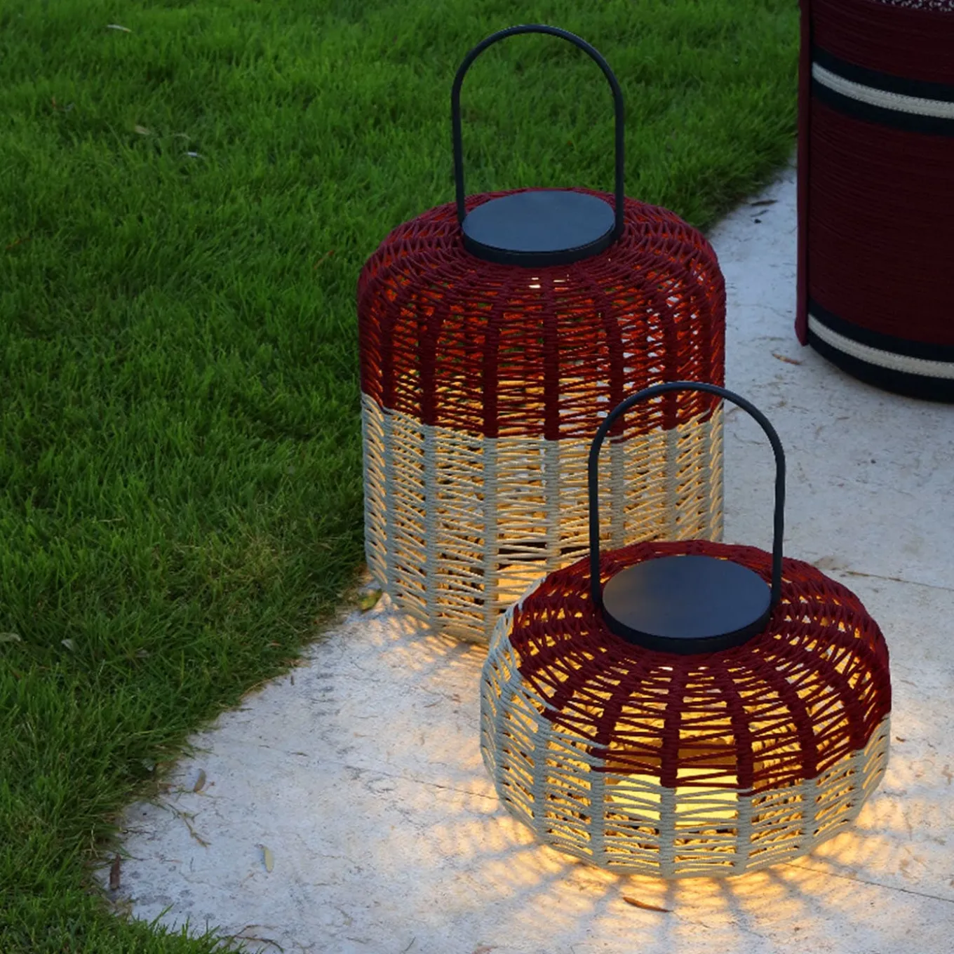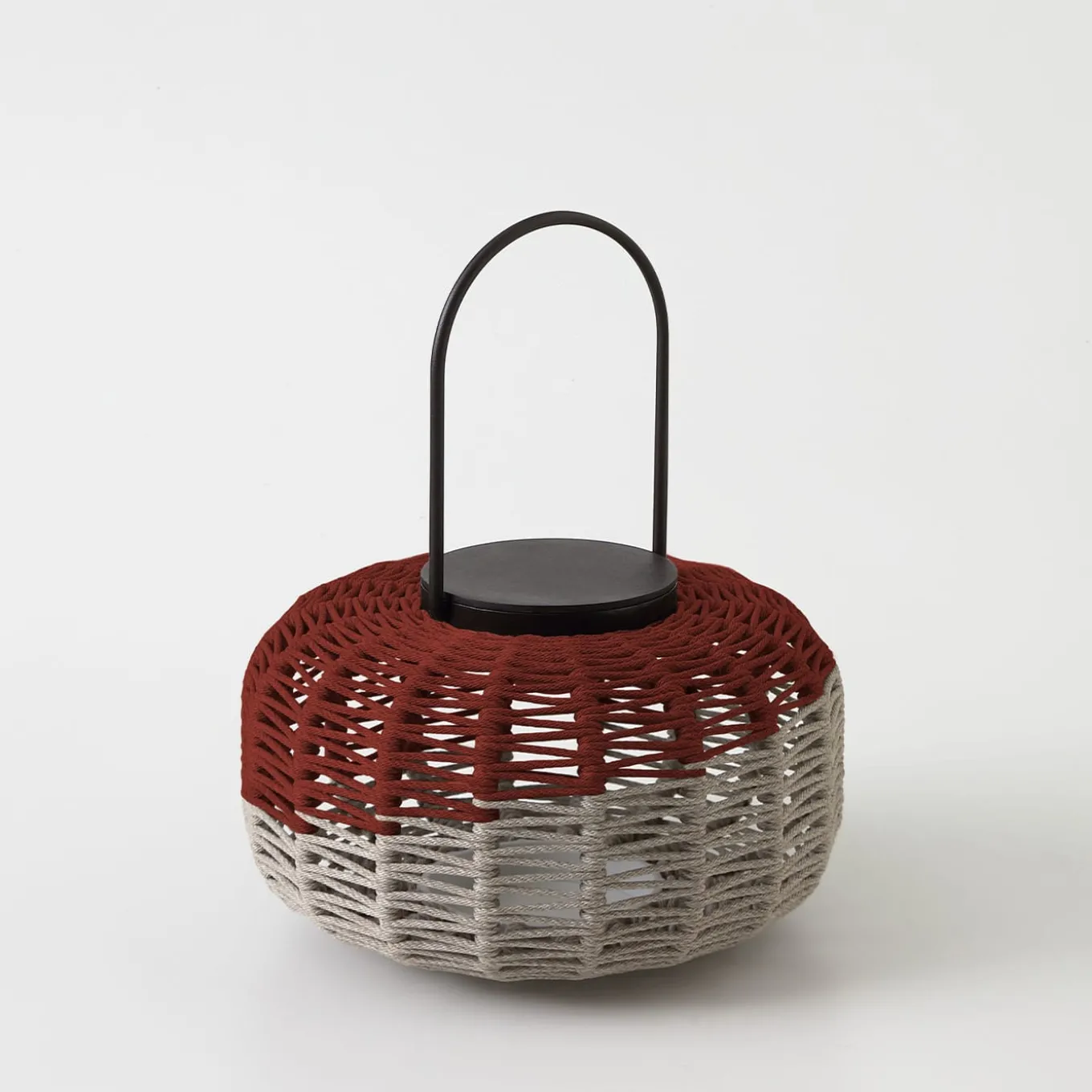 A superb addition to both indoors and outdoors, Susy portable lantern is lit by a LED light (6000mAh – 5.8 W – 3000K) invisible from the side view, that can be inserted and removed thanks to a magnetic mounting system. Rechargeable via a supplied USB cable, it’s decorated by Antonio Marras using ropes made of Olyna™ yarns. The aluminum frame and handle make it easy to carry. This lantern can be built up into a totem using 3 different product sizes: ∅36×82, ∅36×62, ∅36×42 cm.