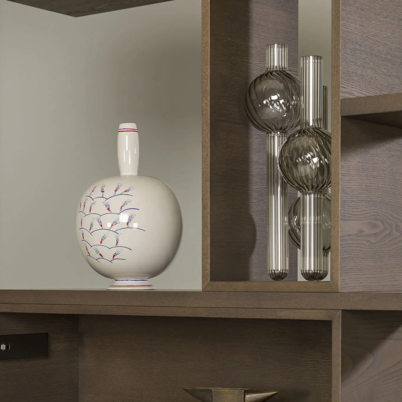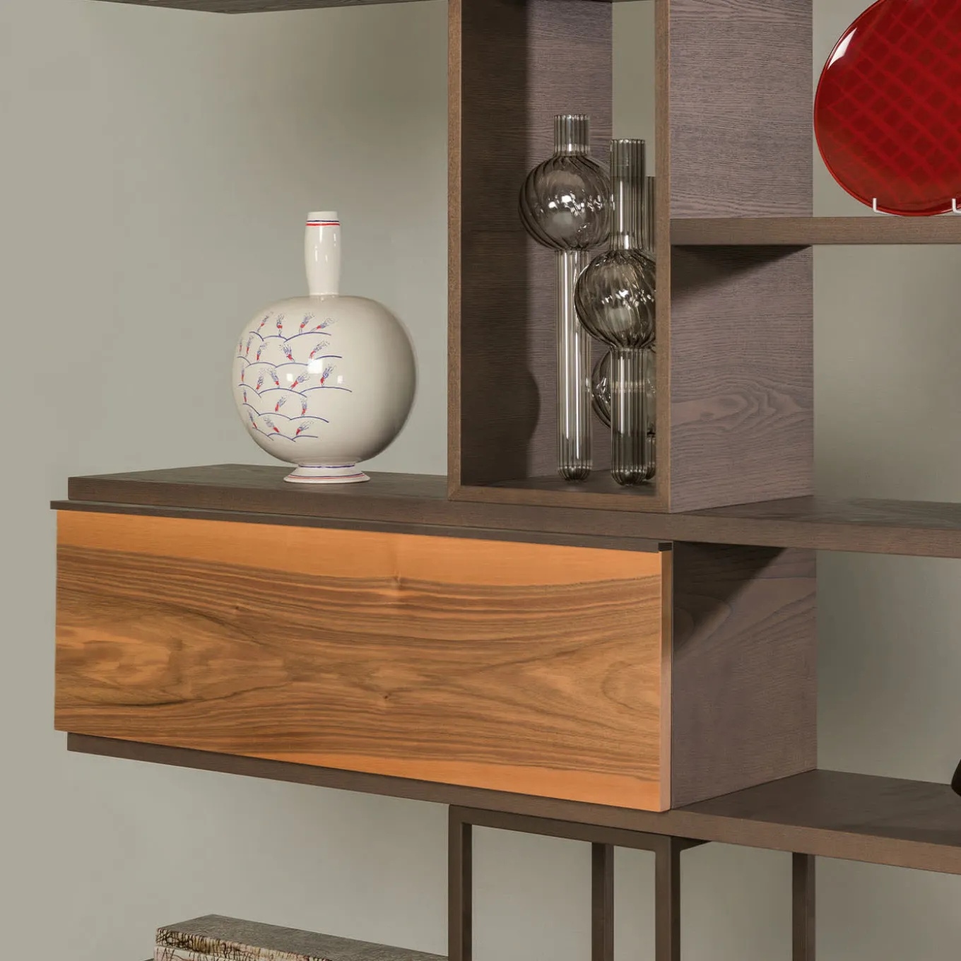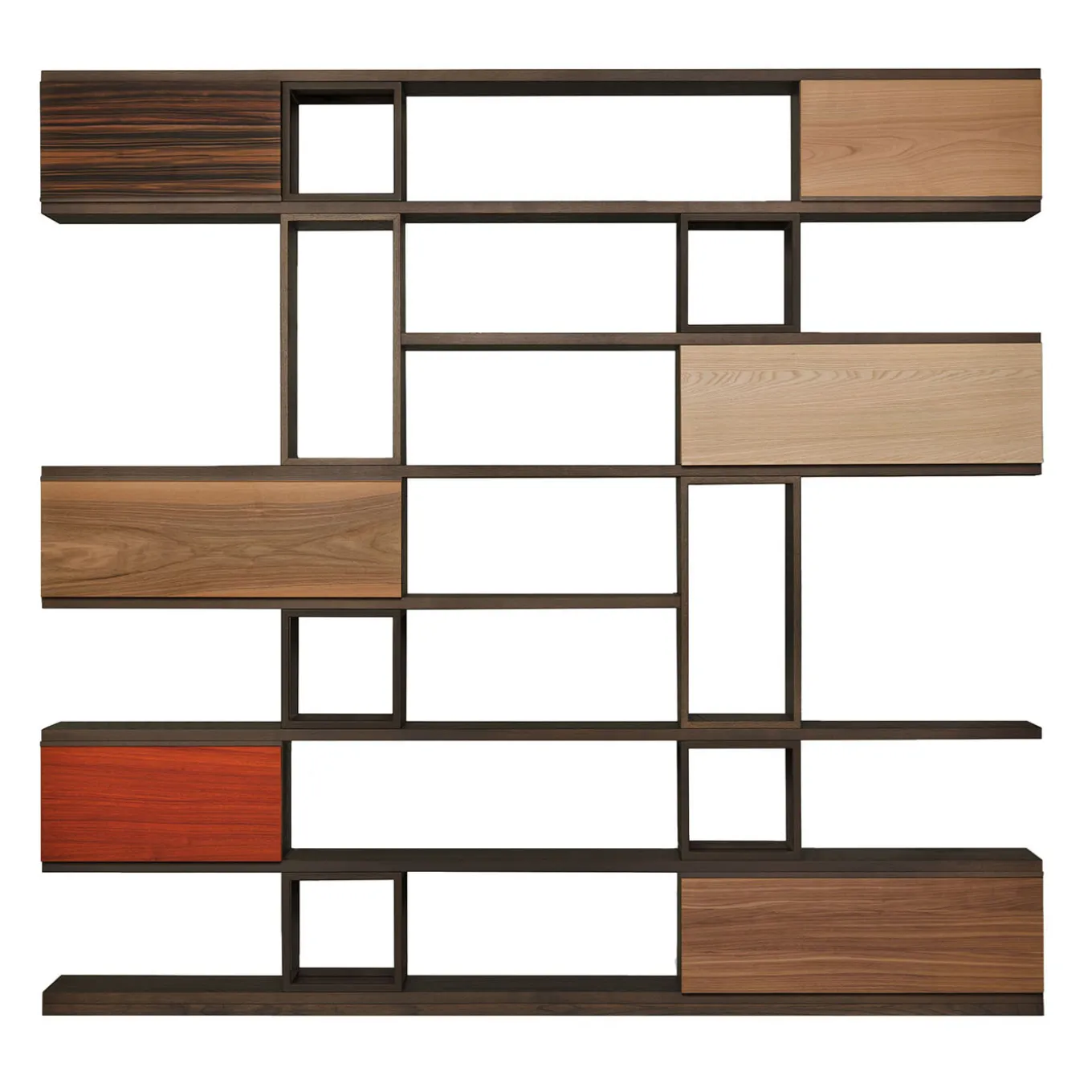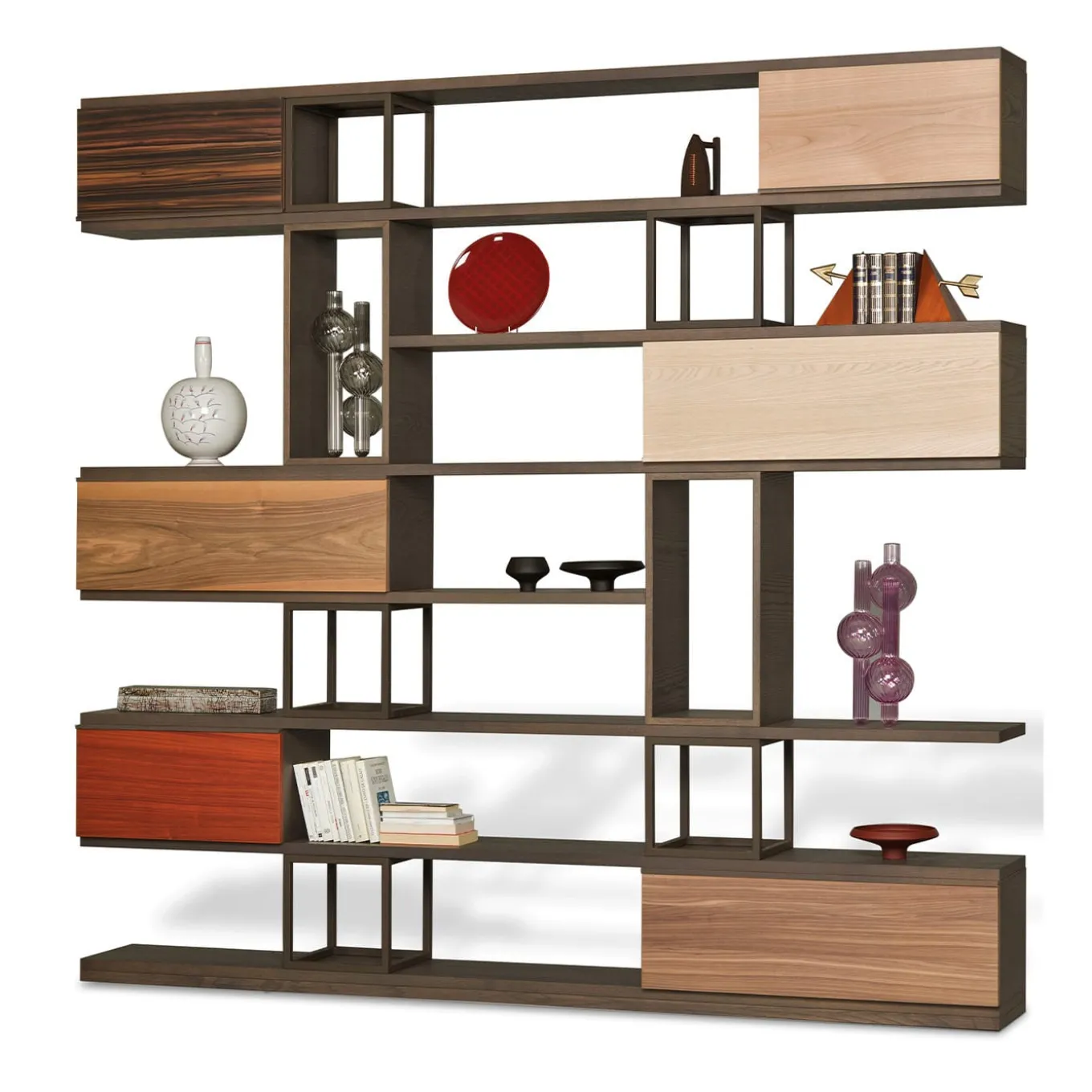 An extraordinary game of lines and perspectives, this bookcase designed by Libero Rutilo merges timeless architectural value with contemporary design. Its distinctive structure is handmade of ash wood, boasting open and closed compartments, the latter completed with maple, walnut, cherry, padouk, and Makassar ebony doors. The structure is enriched with iron open compartments.