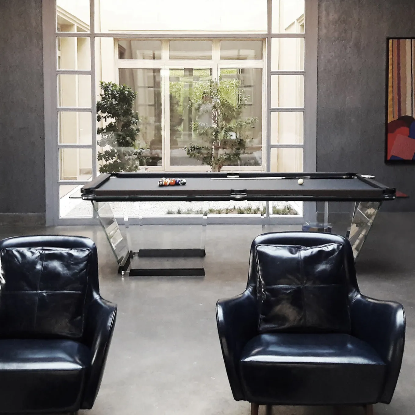 A precious pool set perfect for a home game center, this superb pool table conveys visual lightness despite its imposing design. The tempered top and tapering legs crafted arranging 1.5cm-thick crystal slabs rest atop square bases in polished stainless steel with light bronze-finished durmast elements. Aluminum cushions anodized in black contour the black fabric game pad (available in 25 color options) with polyurethane pocket belts. Authenticity certificate and instructions package included with purchase.
