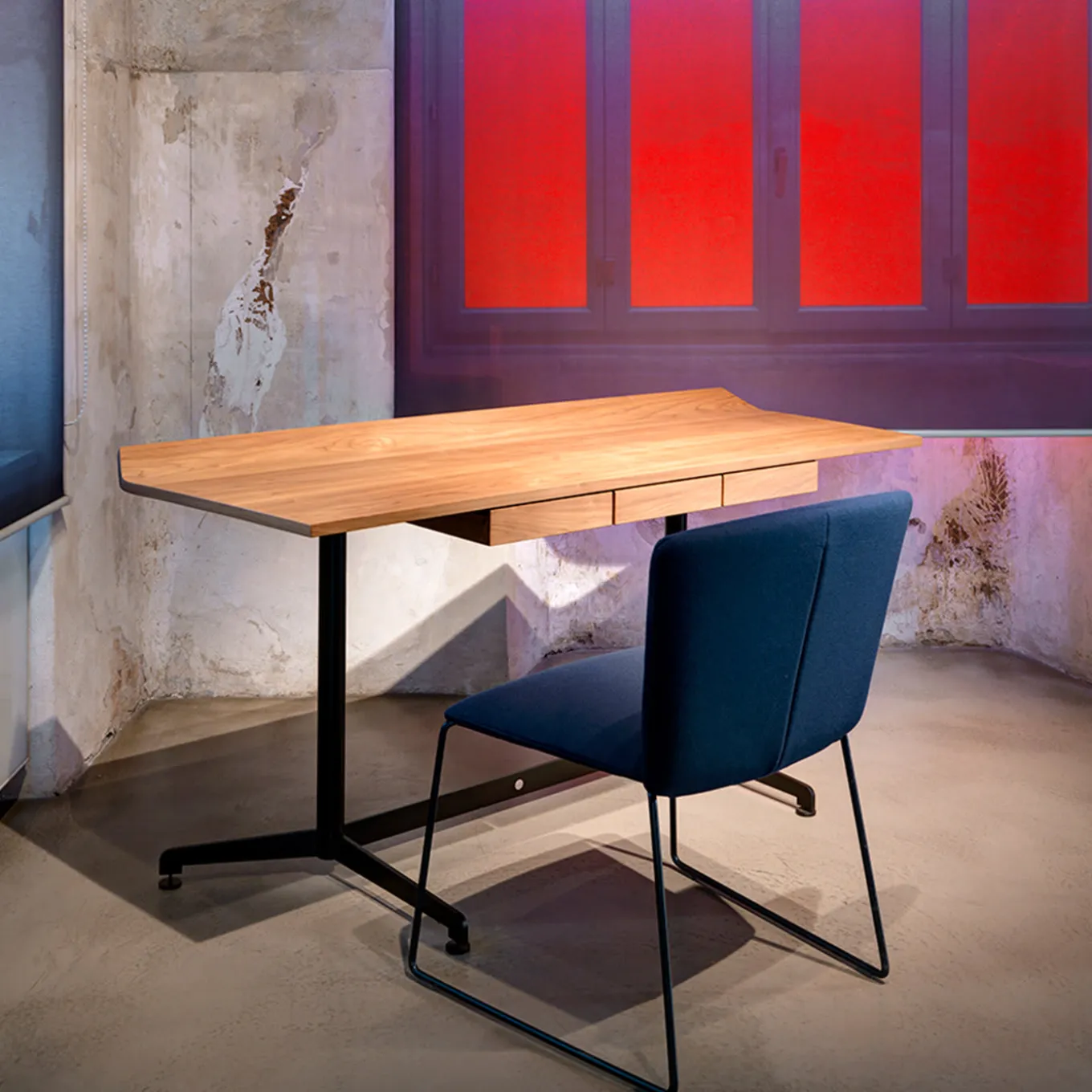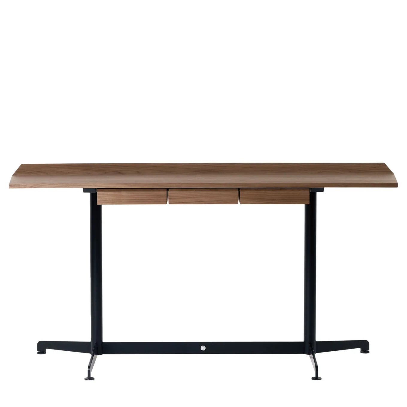 The minimalist and elegant design of this desk makes it the perfect addition to any modern context requiring an efficiently-equipped working station. A streamlined structure in black-painted steel sustains the sturdy top in Canaletto walnut, which incorporates three practical drawers with recessed handles where to store stationery and files that need to be kept at hand during work or study sessions.