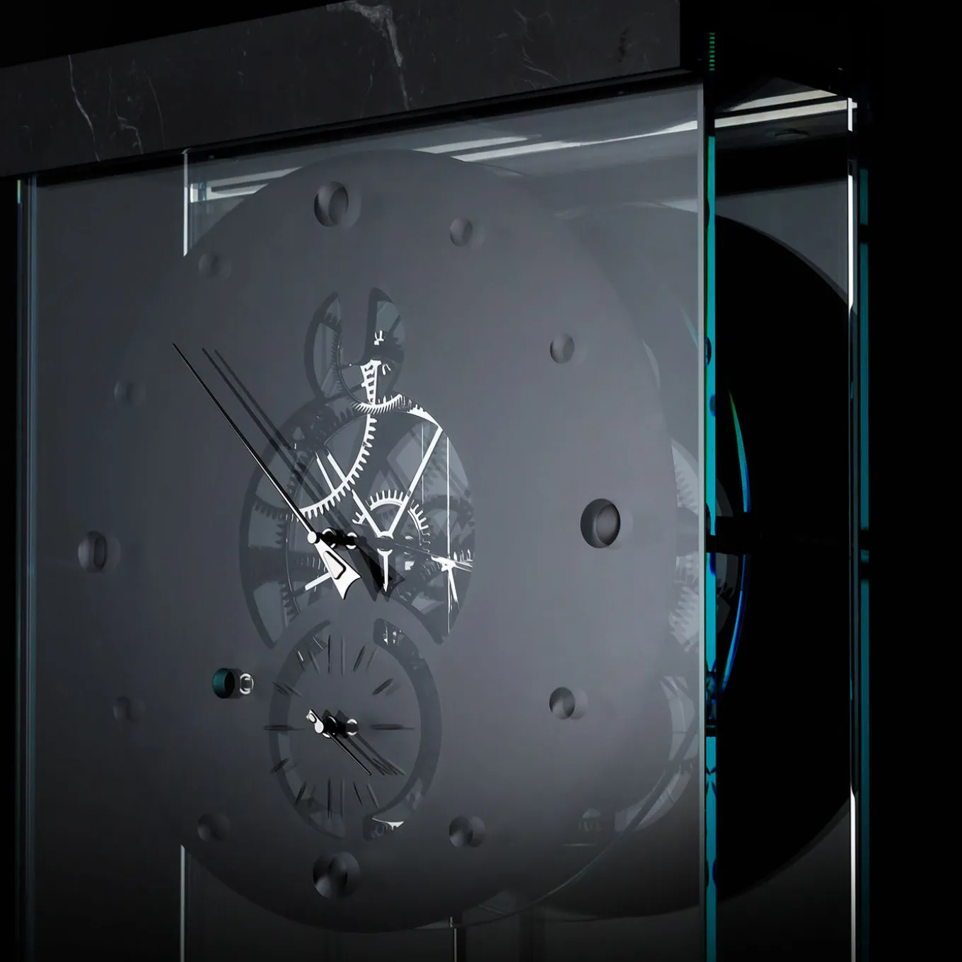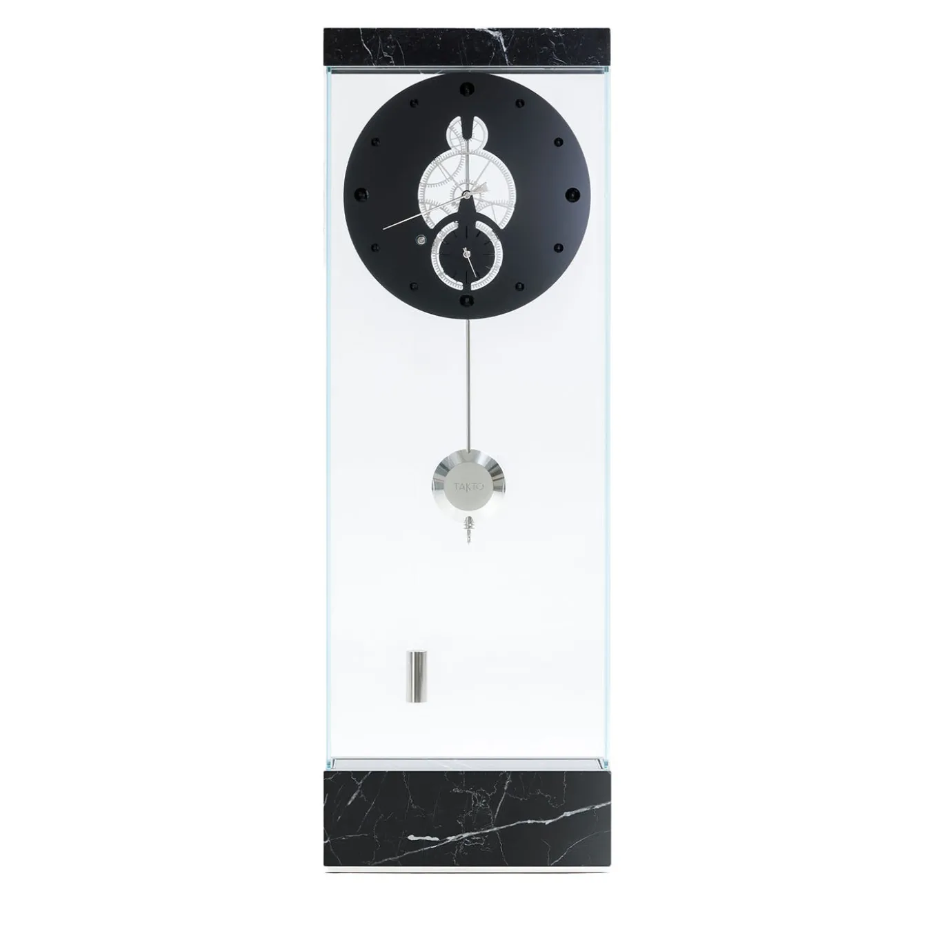 Takto Adagio features a base and frame in black Marquina marble. The dial disc is milled from a single block of aluminum and finished with black anodized guilloché. Its 15 mm thick extra-clear tempered glass structure displays finely engraved and polished hour and minute markers. Powered by a mechanical movement with a Graham escapement, the internal mechanism includes palladium-coated brass gears and pinions. With a power reserve of 30 days, a beat rate of 3,600/h, and a drive weight of 2.4 kg, TAKTO ADAGIO combines precision engineering with refined aesthetics.