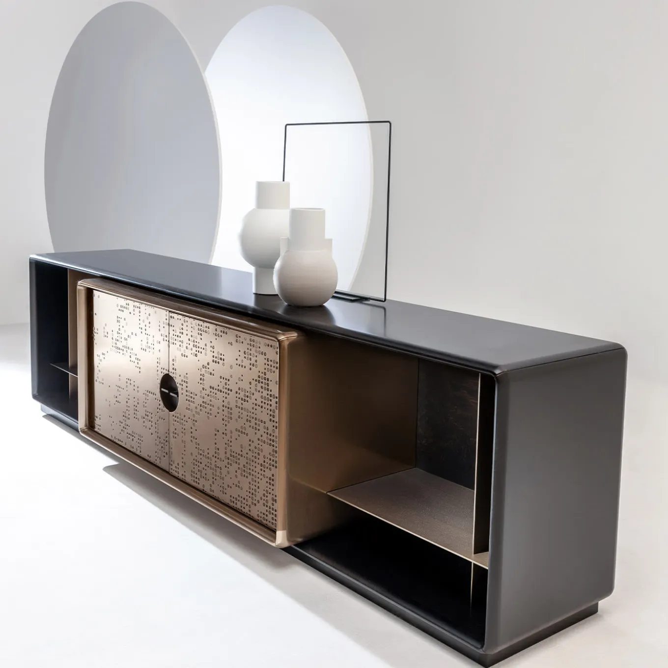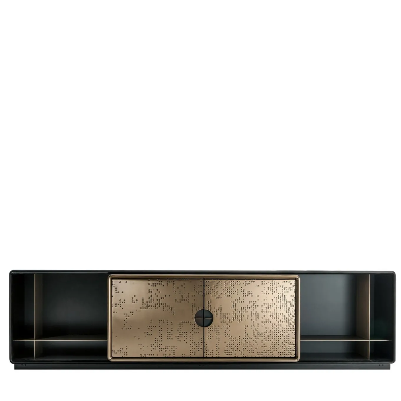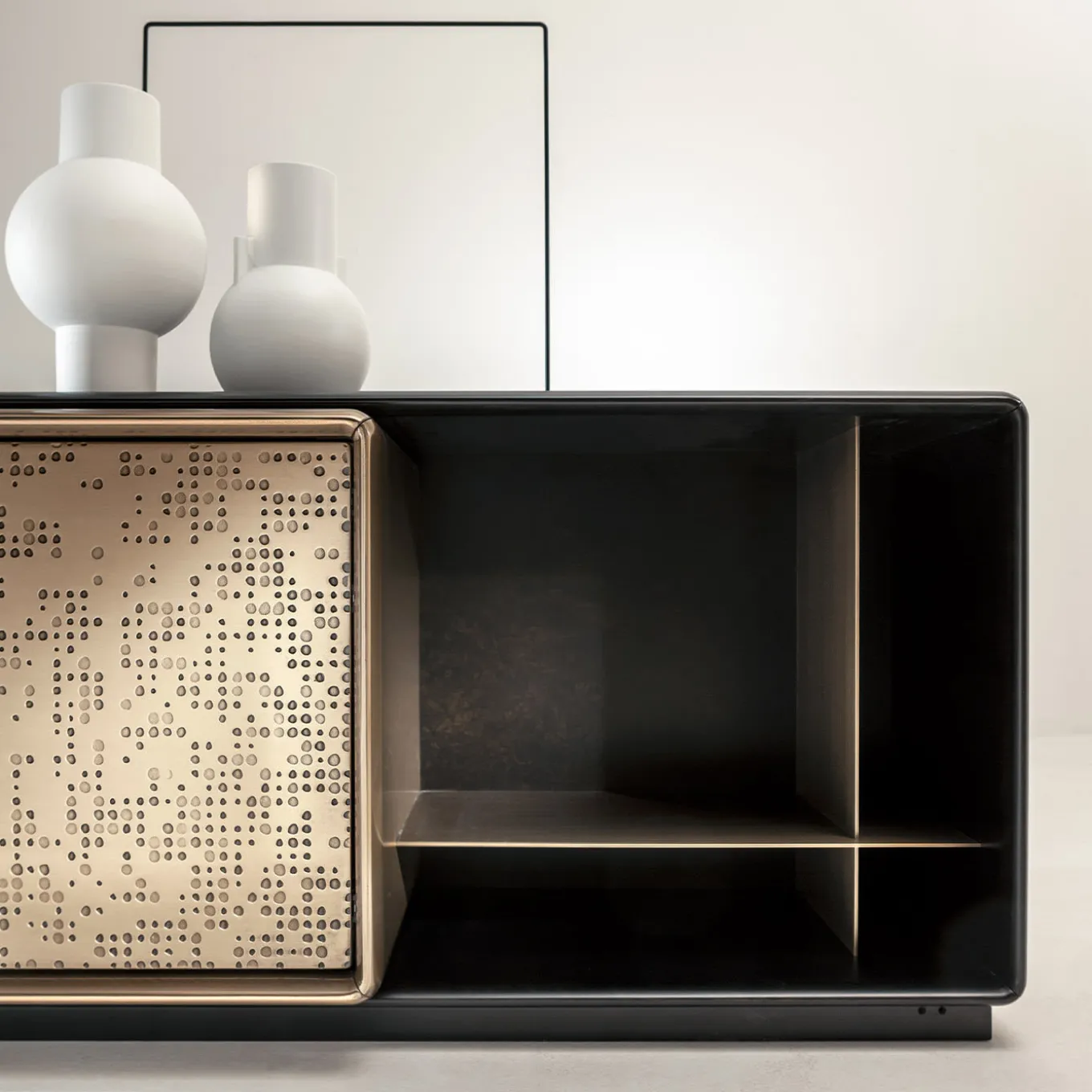 Offering ample storage space with its well-balanced combination of open and closed compartments, this sideboard makes for a refined addition to modern decors. The metallic hinged doors are marked by the so-called “unlimited” texture and open to reveal one shelf and one drawer. The interiors are finished with the delabré metallic lacquer, while the rest of the frame boasts a luxe vintage bronze patina finish. Please contact the Concierge for customization inquiries.