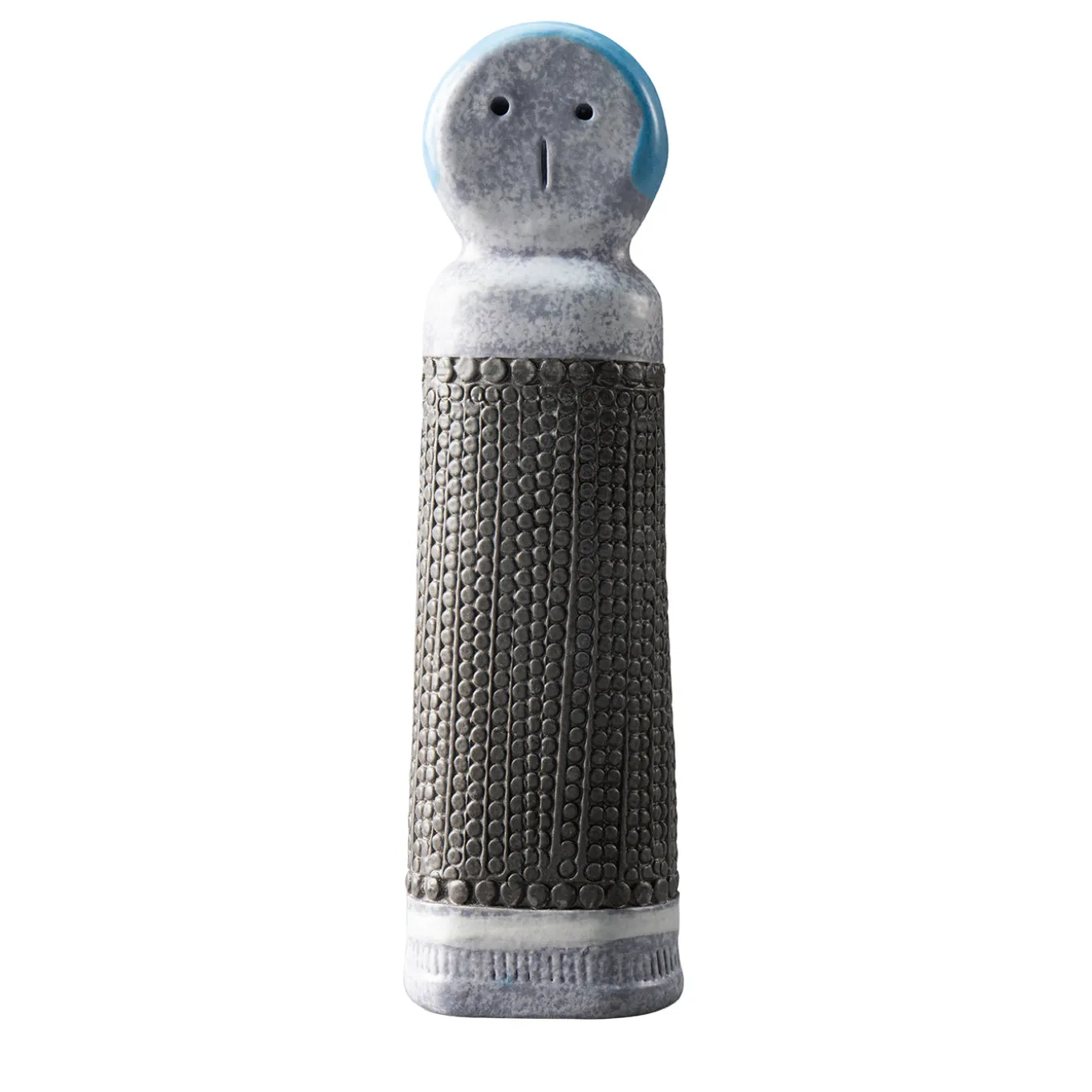 Anthropomorphic figurine from the Riedizioni archivio storico collection, featuring subtle incision details beneath bluette and violet glaze accents. This limited edition piece, reissued in 2021 with only 199 units available, stands as a unique decorative object combining textured patterns and minimalist facial features for a contemporary yet timeless aesthetic.