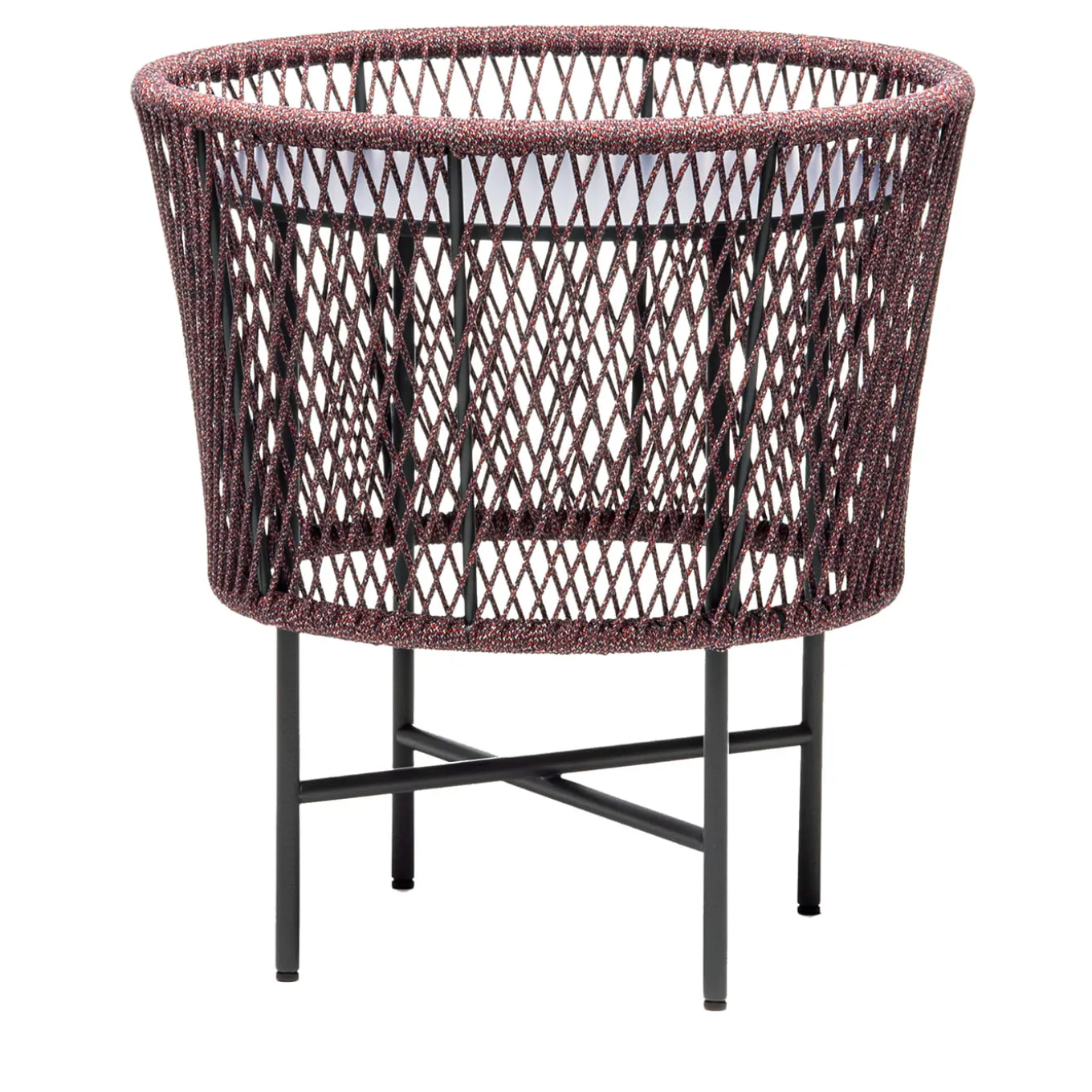 An intricate diamond tracery obtained by interlacing purple marine ropes – also wrapped around the borders of a drum-like shell – defines this stylish accent table apt for outdoor use. The round, blue-finished top is encased within, where it can support a lantern or a group of burning candles. All elements are fitted to the general steel structure powder-coated in anthracite gray. Please consult the Artemest catalog for other colors.
