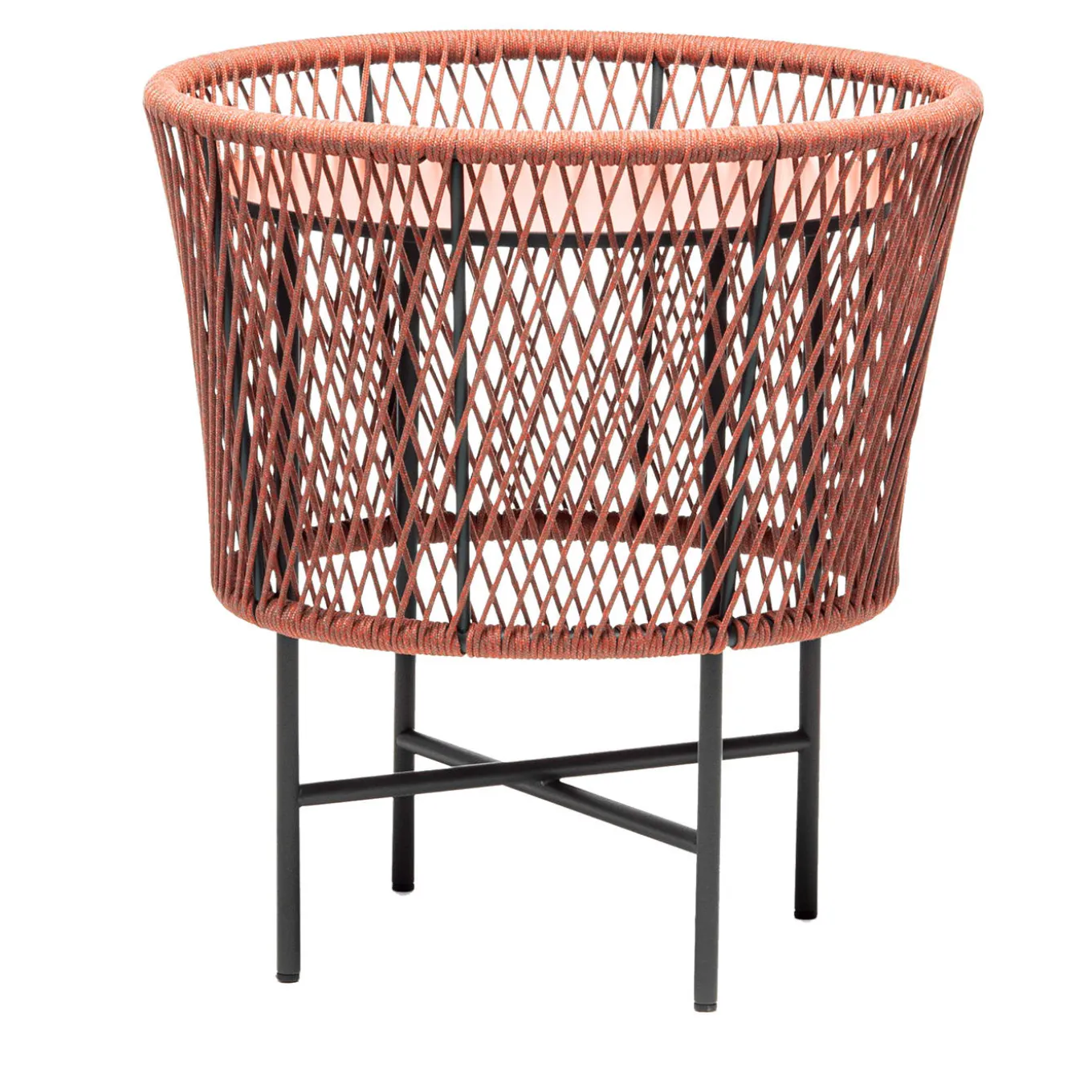 This superb accent table was designed with originality and sleekness in mind. Marine ropes get minutely hand-wrapped around the upper section of the frame, outlining a flared shell enlivened by an intricate diamond design simultaneously revealing and concealing the circular HPL housed within. Marked by intense curves and linear elements, the steel structure powder-coated in anthracite gray allows safe outdoor use. Please consult the Artemest catalog for other sizes and color variants.