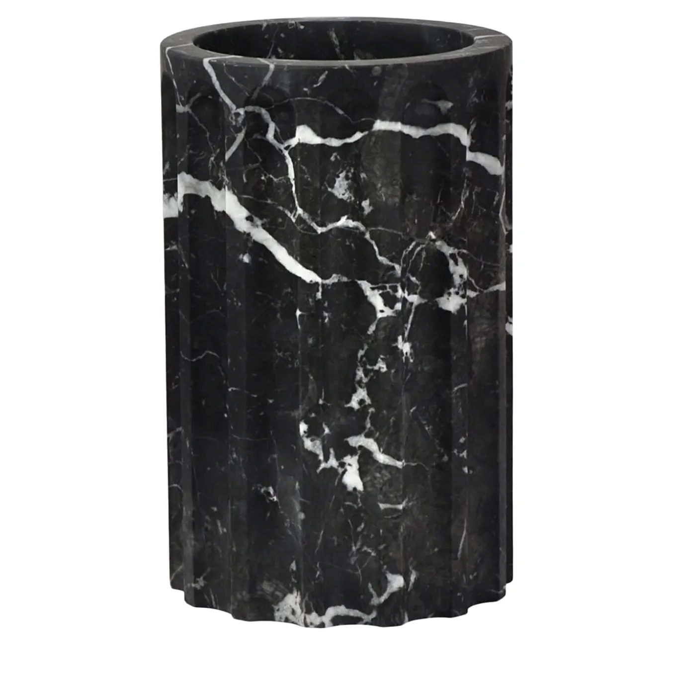 TAN is the central part of the decorative vase POR TAN TE, contributing to its overall modular design. This part can be used independently as an elegant decorative element or combined with the other two parts to complete the full vase. Designed in collaboration with SuonareStella, this vase is crafted from satin black Marquina marble, a material that imparts natural elegance, with each piece being unique due to its distinctive veining.