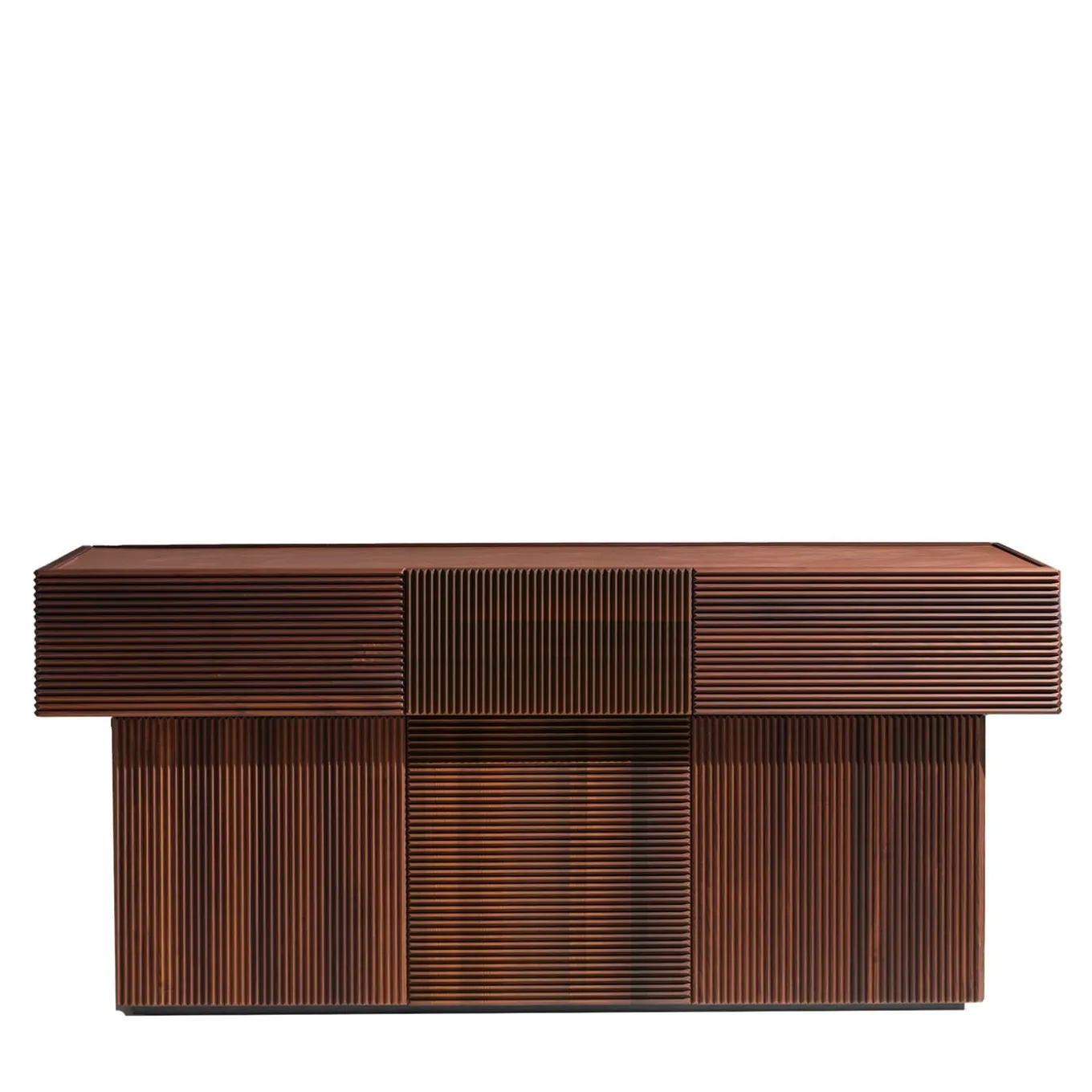 Minimalism and traditional craftsmanship effortlessly collide in this splendid sideboard handcrafted of wood defined by a ribbed texture. Comprised of three drawers on the top and three doors on the supporting column, it will ideally complement a contemporary-style living room or lounge interior. Please consult the Concierge for further details on materials and finishes.