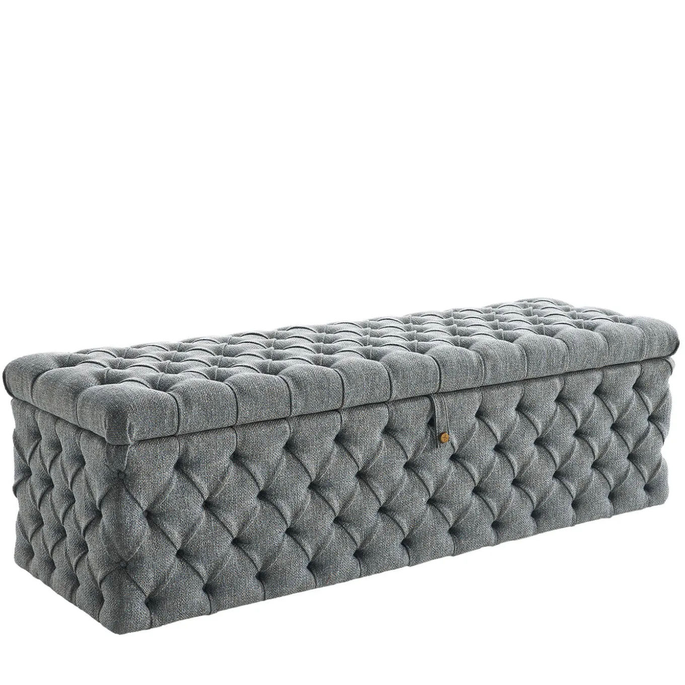 A multifunction design of timeless elegance, this bench and storage unit is a testament to craftsmanship and style. Part of the Studio Interior Collection, it is meticulously handmade of solid wood, upholstered with an exquisite hand-tufted gray fabric, enriched with a brass button and logo. Offered in other versions on the Artemest catalog, please consult the Concierge for more details.
