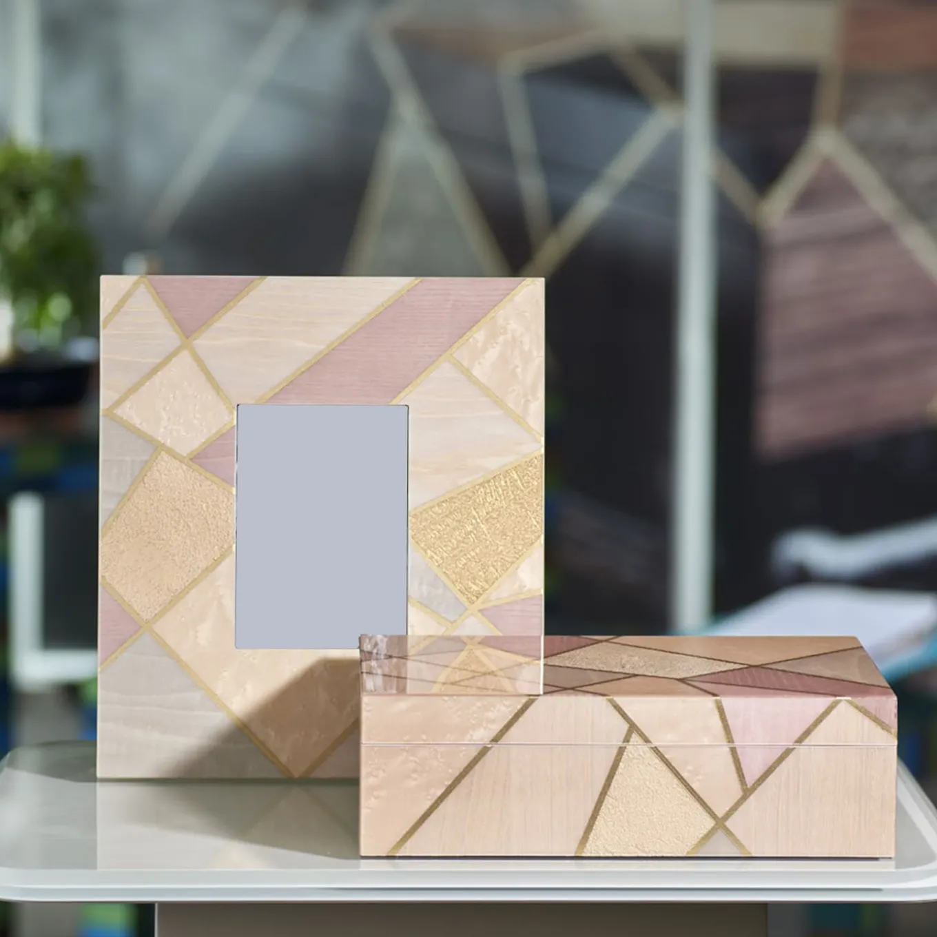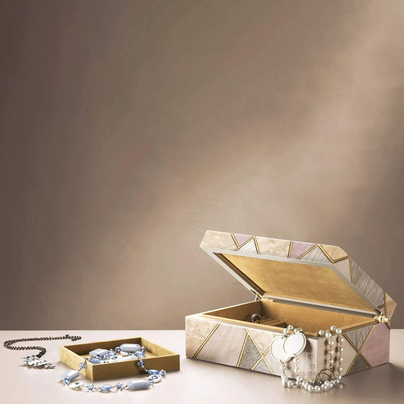 Masterfully handcrafted and unique, this jewelry box is a triumph of precious wooden inlays of Bolivar, ash, rosewood, and ebony made feminine by a palette of delicate tones of beige and pink. Golden profiles cross the silhouette, underlining the contrast between its assorted wood essences. Innerly lined with beige Alcantara, the box sports a refined brushed and mirrored finish.