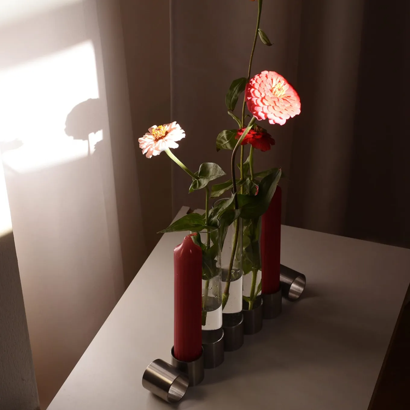 Candleholder and flower holder in a single object, Tempio del Tempo was conceived as a small altar for the home, created through the union of simple and symbolic shapes that fit together without connections and remain divisible: two stainless steel rings joined together with invisible welding, a pure soy wax candle with a cotton wick and a borosilicate glass vase. The removable closure of the steel base is made of recycled rubber and creates the ideal support to accommodate candles. Candles and glass vases included.