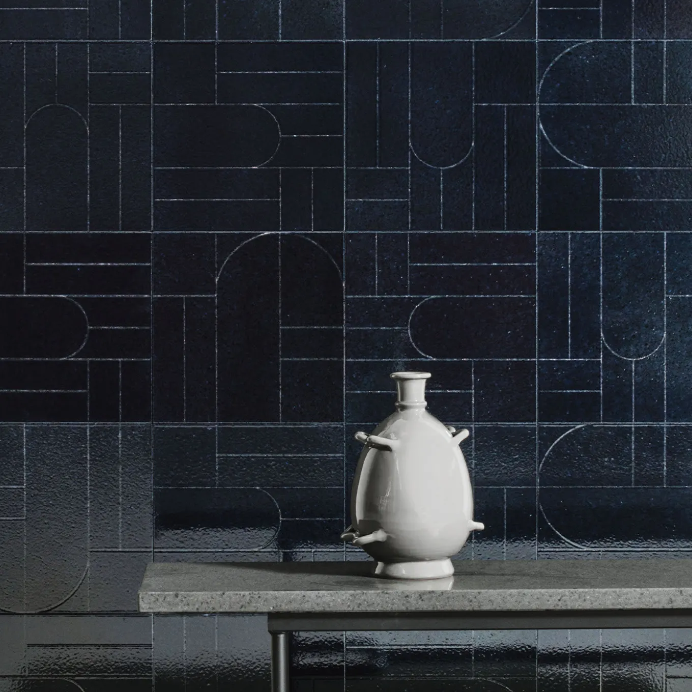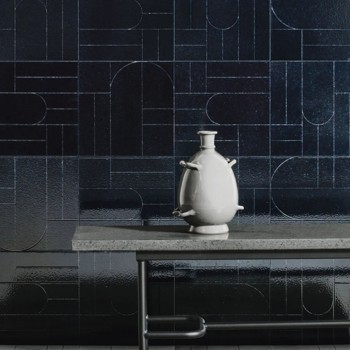 Fashioned of Etna volcano stone, each of the eleven tiles composing this set was handcrafted by masters Nicolò and Fausto Parrinello in Caltagirone, Sicily. Geometric-style patterns inspired by Sicilian traditional architecture emerge from the blue glaze, a decoration sure to lend a refined character to both wall coverings and floors. It withstands both impacts and temperature jumps.