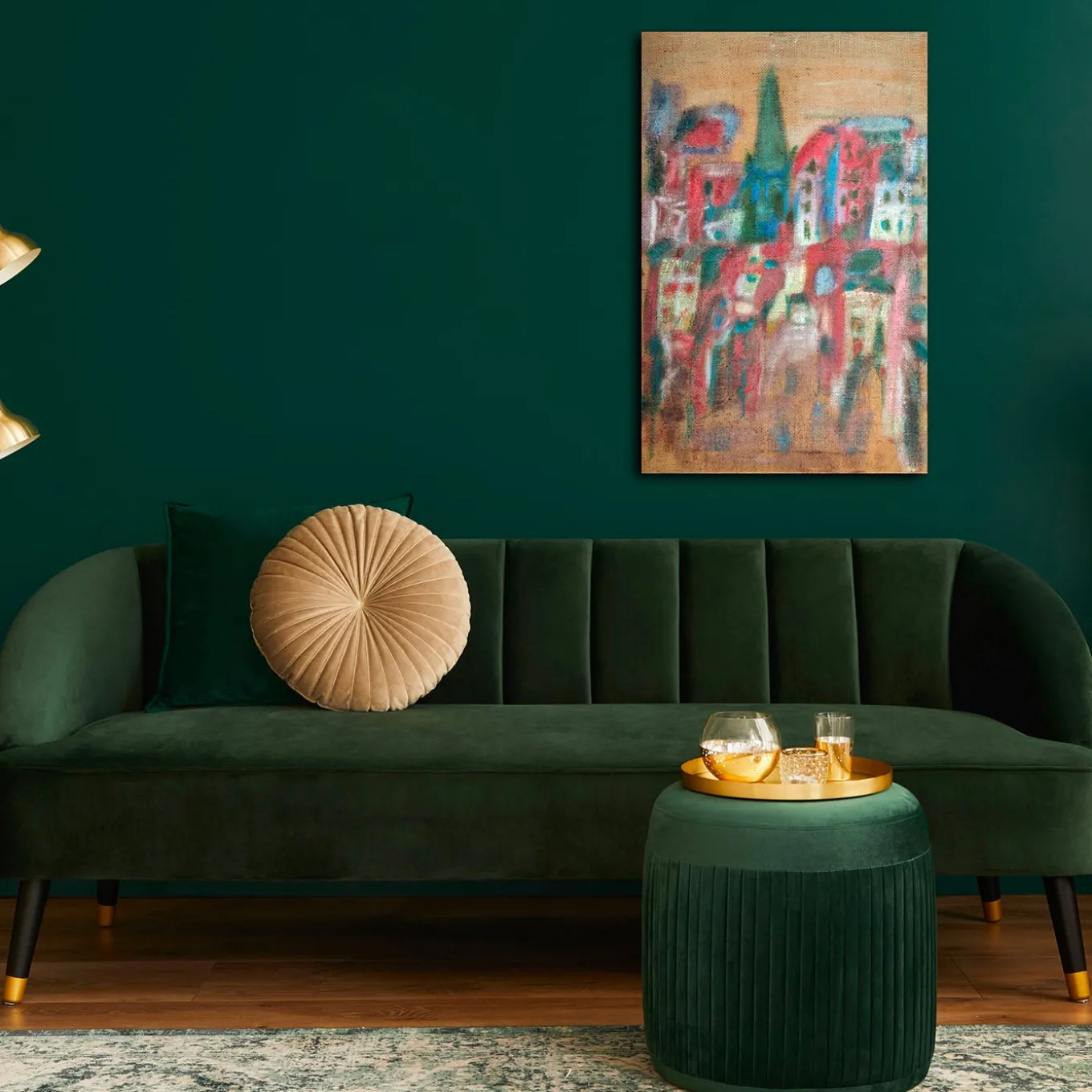 In this artwork past and present intertwine in a suggestive harmony. The white and red, colors of an ancient and magical city, blend into a single vision. The bell tower, a luminous beacon, guides the eye through a maze of houses, creating an intimate atmosphere filled with human warmth. The technique used by the artist creates an illusion of depth and movement, inviting the viewer to explore every corner of this imaginary city.