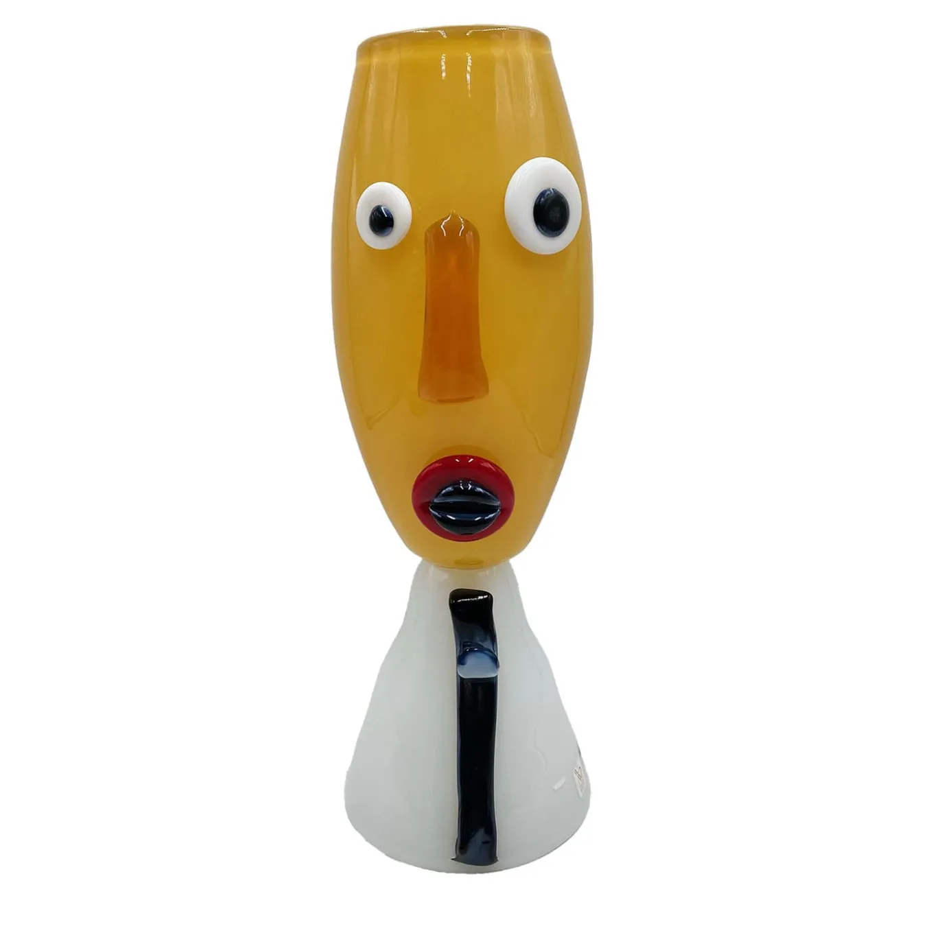 Eccentricity and preciousness coexist in this superb anthropomorphic sculpture offered in a vivid chromatic scheme. The different-sized wide-open eyes trace an expression standing halfway between surprise and confusion that lends this sculpture an outstandingly human spirit. A meticulous artisan crafting process implies the absolute uniqueness of every single piece.