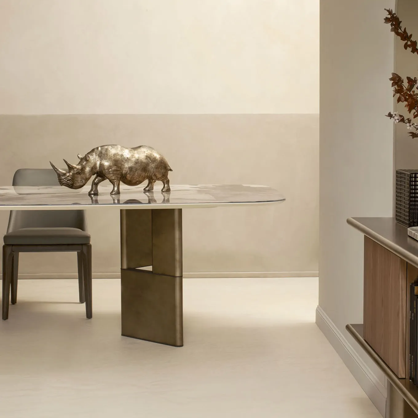 Distinguished by its innovative design and meticulous craftsmanship, this table features curved MDF legs lacquered in Oxidized Bronze with shaped metallic inserts, coated in epoxy powder, and finished in dark-burnished Bronze. The contoured tabletop is crafted from printed glass with a Patagonia marble effect, supported by matching lacquered MDF. A blend of modern aesthetics and functional elegance, this table promises to elevate any living or dining space with its sophisticated style.