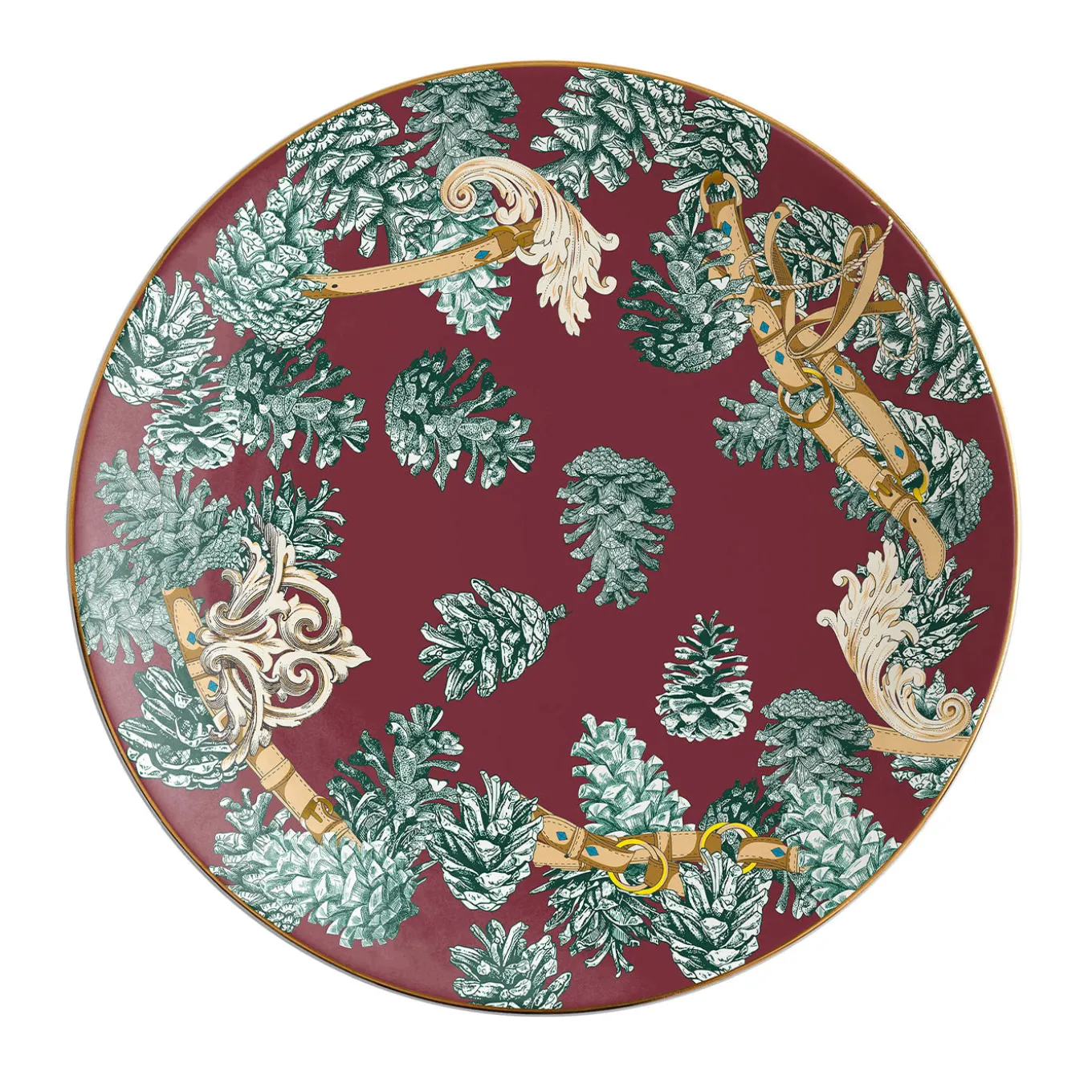 The Big White collection is dedicated to Christmas and its magic. The design of this charger is made up of an intertwining of pine cones and fences with gold details. The typical colors of Christmas are gathered here and used to tell the tradition and romantic imagery that it brings with it in an elegant and impactful way.