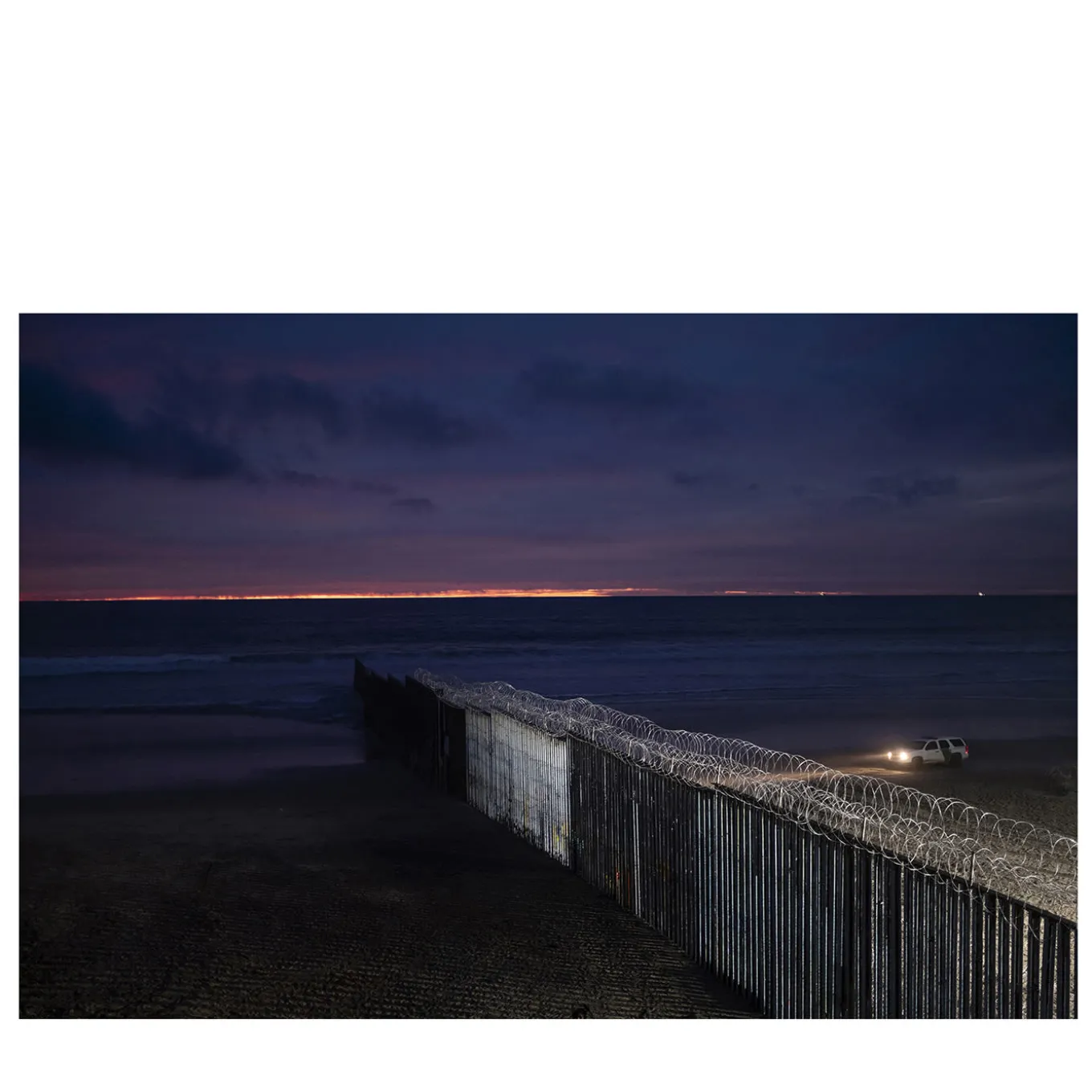 The US-Mexico border wall on the sunset at Tijuana’s beach in December 2018, Mexico. On the American side, a US Border Patrol (USBP) car lights up the wall to avoid Central American migrants trying to cross the border. In 2018 and 2019 Fabio Bucciarelli has been working on the exodus from Central American countries to the US. The Artwork is available in Limited Edition in two sizes, printed on fine art archival paper Hahnemühle Photo Rag Ultrasmooth 305 gsm, signed and certificated.