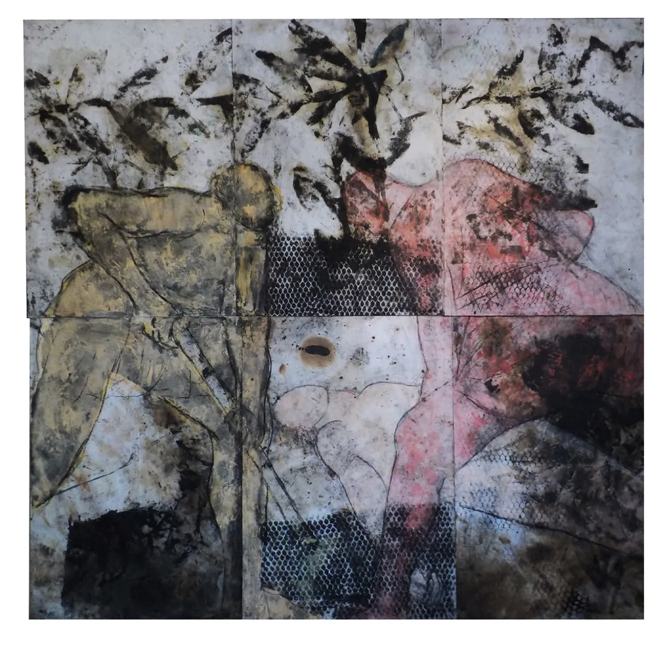 In this unique artwork, the echoes of Renaissance and Baroque resonate through a contemporary lens. Focusing on a detail from Caravaggio’s “Burial of Saint Lucy,” it depicts two figures digging beside the saint’s body. The artist employs a mix of materials, including paper layered onto canvas, using a calcographic press to create intricate patterns infused with alcohol-based paints and pigments. The artist uses a torch as their brush, seamlessly blending ancient and modern worlds.
