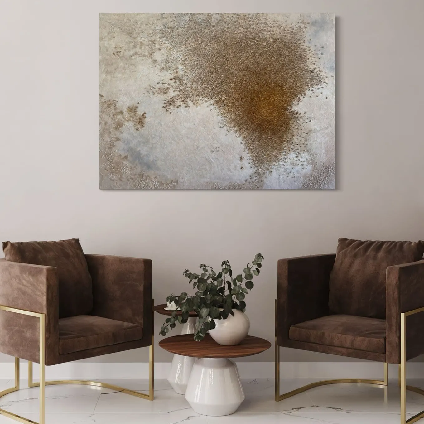 This textured resin painting offers an abstract interpretation of Verona, famously known as the city of love. It features a detailed mosaic of ochre-toned tesserae symbolizing people and buildings, with the silhouette of the river Adige subtly woven into the composition. Created using a unique blend of sand, resin, and adhesive, the artist skillfully applies pigments to enhance the depth and texture. It includes a certificate of authenticity, affirming its originality. One-of-a-kind piece.