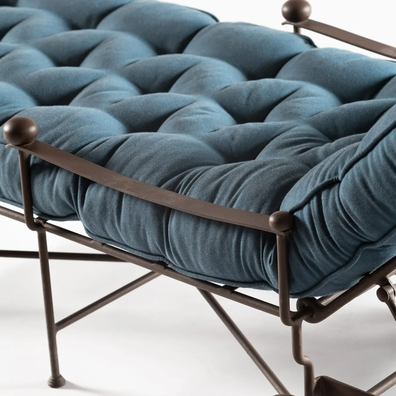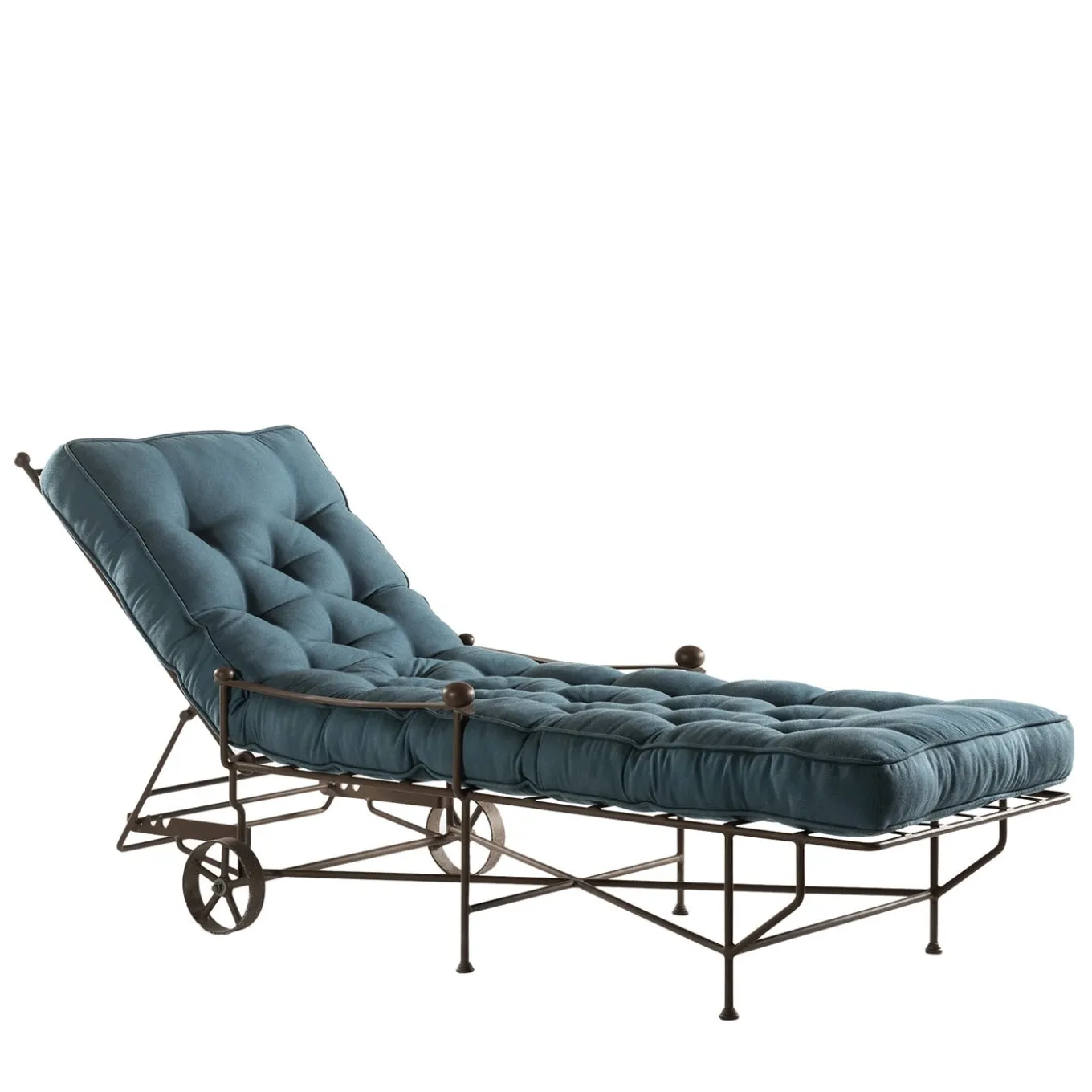 Taking a nap in the middle of a blooming garden while not renouncing comfort is possible with this precious chaise longue of 18th-century inspiration designed for outdoor use. The airy steel frame is coupled with a generously padded mat enveloped in a blue cover adorned with a tufted design. The backrest can be adjusted and wheels ease the design’s repositioning.