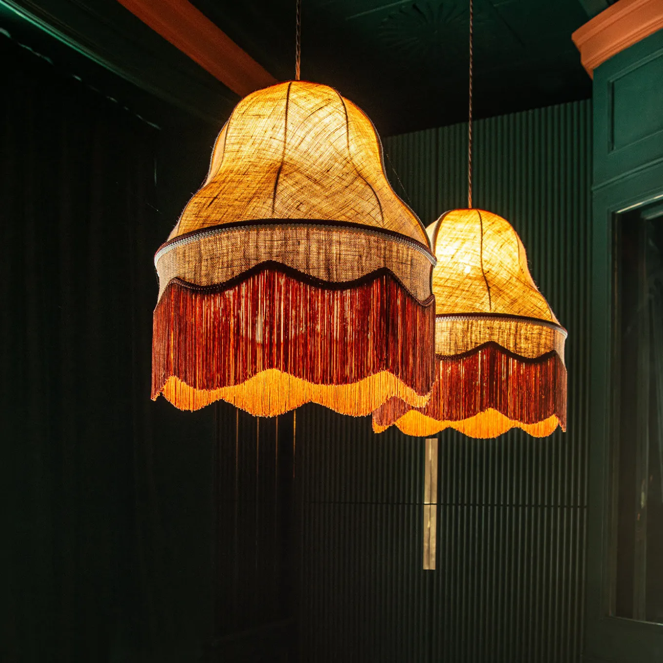 Inspired from the twenties, the design of this suspended lamp suddenly creates a sophisticated but eclectic atmosphere in the interior. The jute lampshade is refined with delicious coloured details as the long fringes, that create a playful ways out for the light.