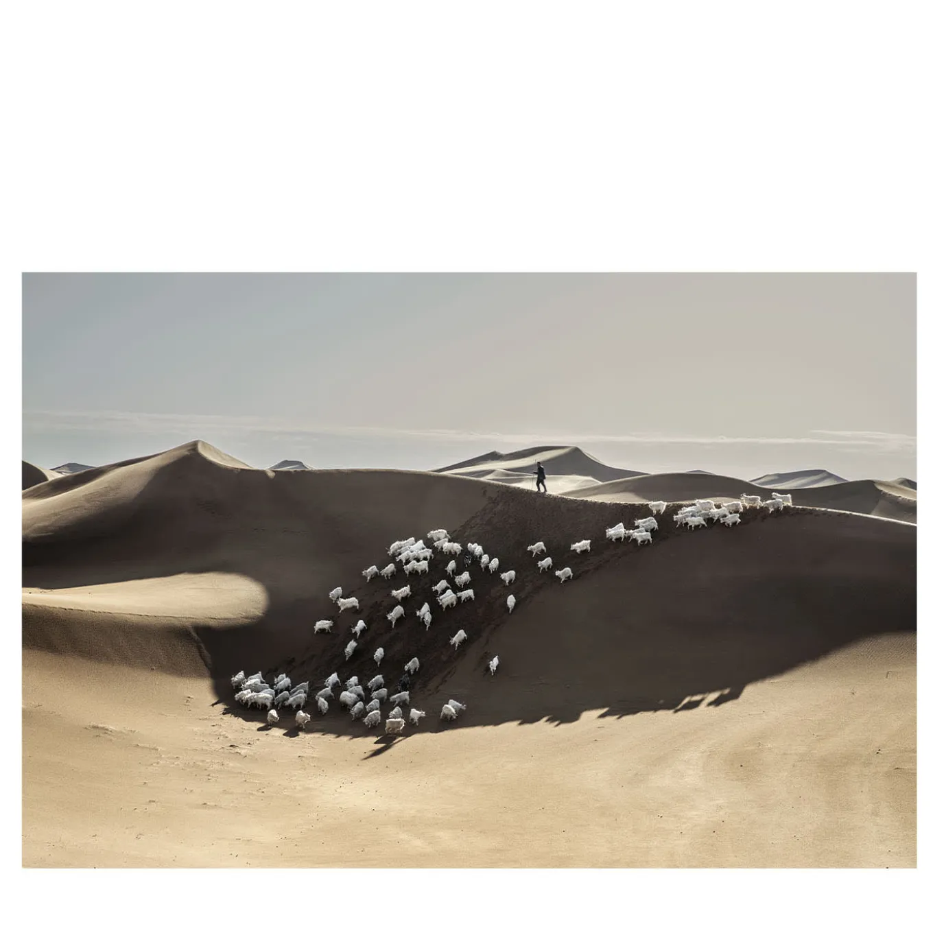 This striking photograph captures the resilience of Mongolia’s traditional goat farmers, as a flock moves across the vast dunes of the Gobi Desert. In the remote Alashan region, framed by the Helan mountains, the harsh landscape endures dramatic temperature changes. The image is a tribute to the farmers who have lived and thrived in one of the earth’s most inhospitable environments, even as their way of life faces threats beyond their control.
