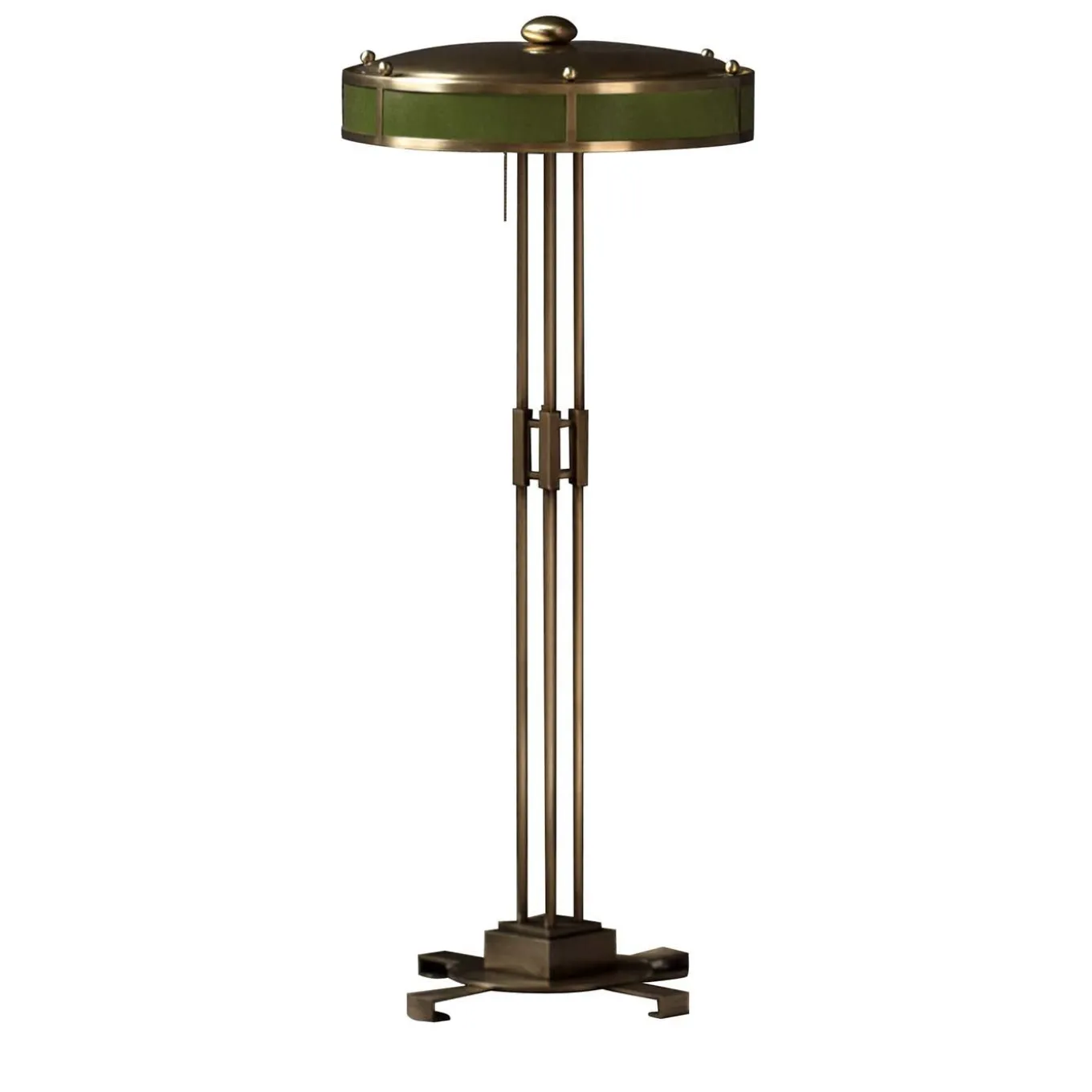 With substantial proportions with a delicate shade, this floor lamp has an allure that will bring glamour to any surroundings. Made of brass-plated steel and inspired by the Italian design of the early 1930s, four parallel tubular rods are supported by a square resting on a circular base with four L-shaped feet. The eye-catching circular lampshade has a closed design with a vibrant green faux vellum border and a globe-shaped accent on top. Available also in nickel-plated steel.