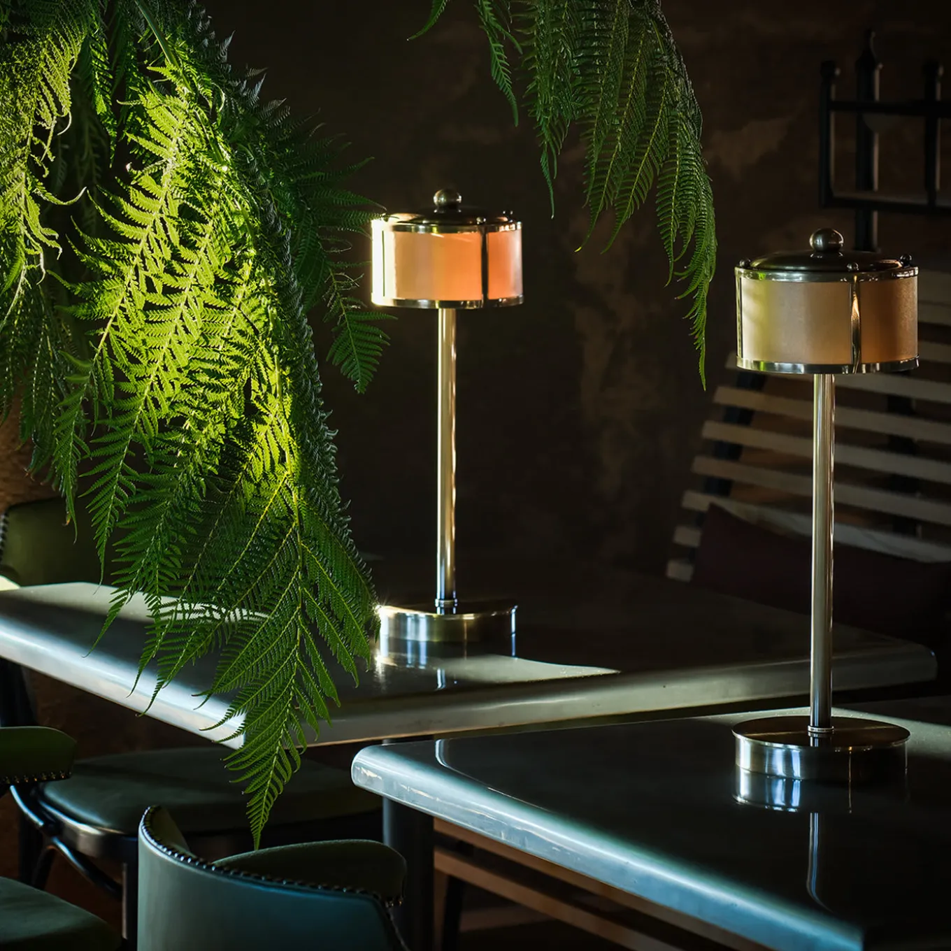 Brimming with timeless elegance, this 1930s Italian-inspired table lamp in brass-plated steel will infuse a warm ambiance in any interior. The lamp flaunts a base, stem, and lampshade all in an elegant cylindrical shape. A light-brown hue was chosen as the color of the faux vellum lampshade that is available in other color options, please consult the Concierge for details. Long-lasting battery (up to seven hours per charge) included with purchase.