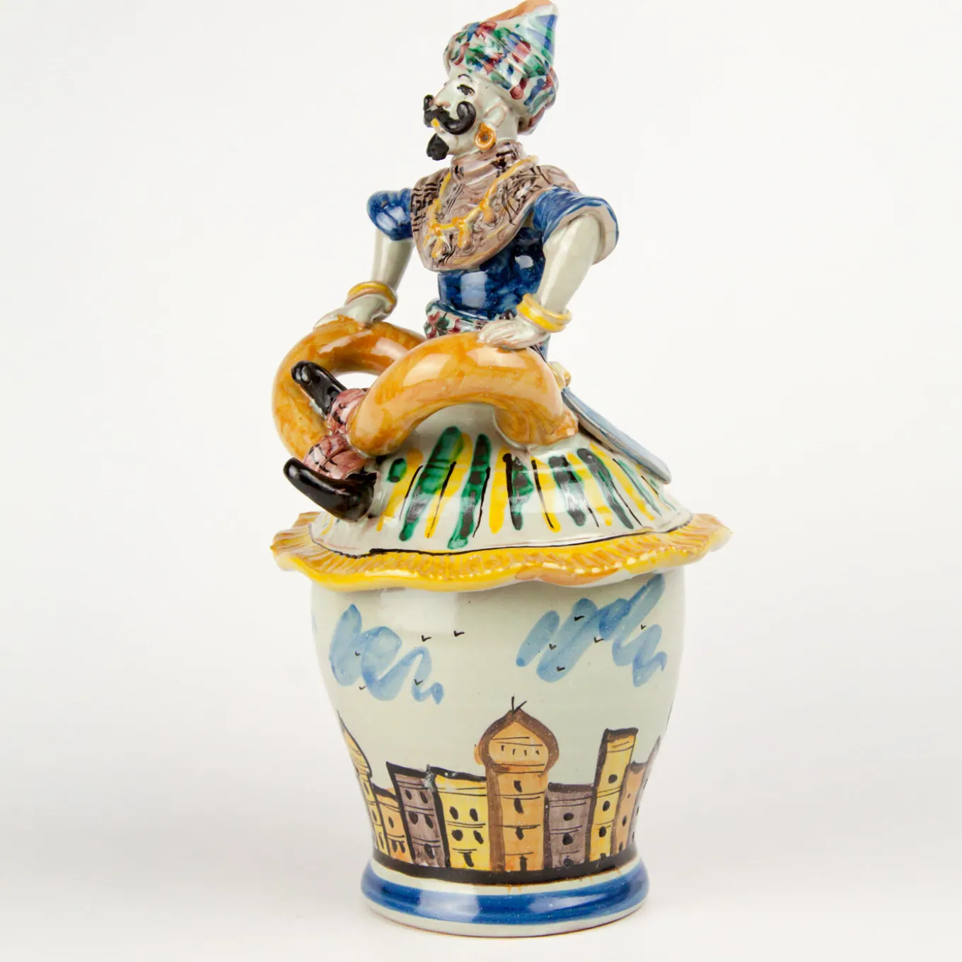 This beautiful whistling vase was achieved using a combination of a lathe, and hand modeling of the details. Depicted in the vase is a man on a flying carpet soaring over a city. The whistling device is located on the back of the figure.