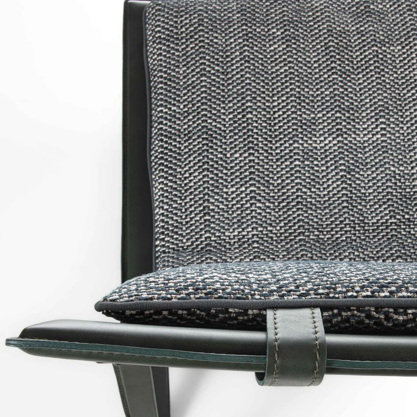 This stylish armchair is composed of a metal base covered in black leather with stitching and a multilayer structure with leather upholstery and stitching with cushion in dark gray fabric. The lining cannot be removed. The frame is upholstered in leather, while the cushion can be covered in leather or fabric, contact the Concierge for more information.