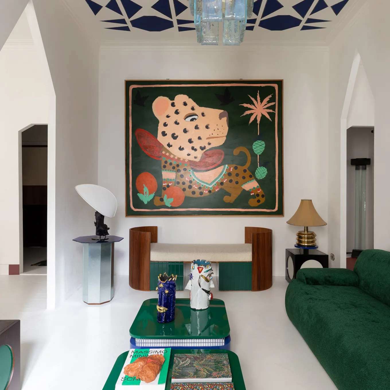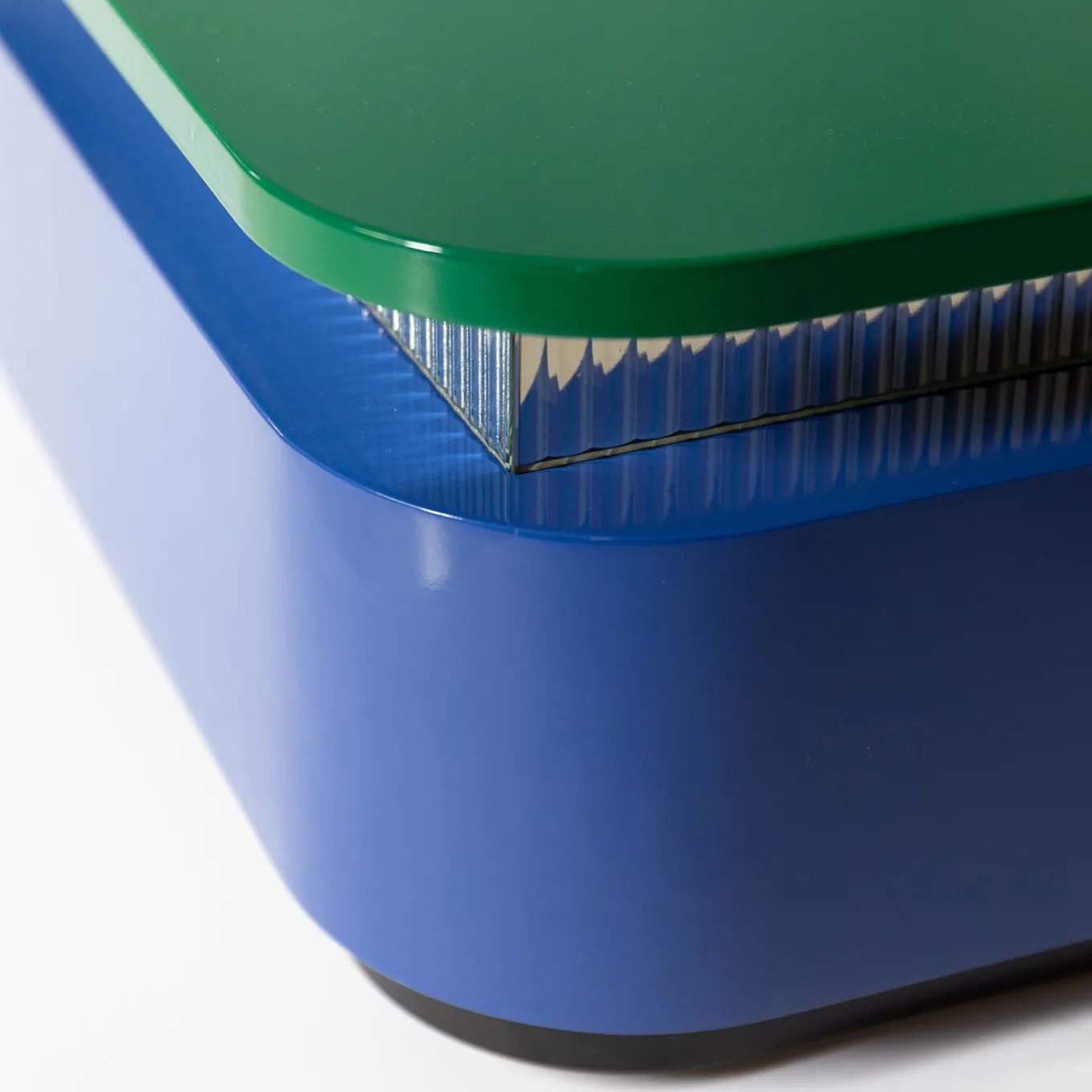 Thelma & Louise 70cm square coffee table from the Motel collection features a bold design with a glossy blue lacquered base and an elevated green tinted top surface. A central fluted mirror insert adds depth and a sophisticated reflective element. Its compact 70×70 cm size makes it a standout statement piece suited for contemporary living spaces, combining vivid color and unique textures to capture attention.