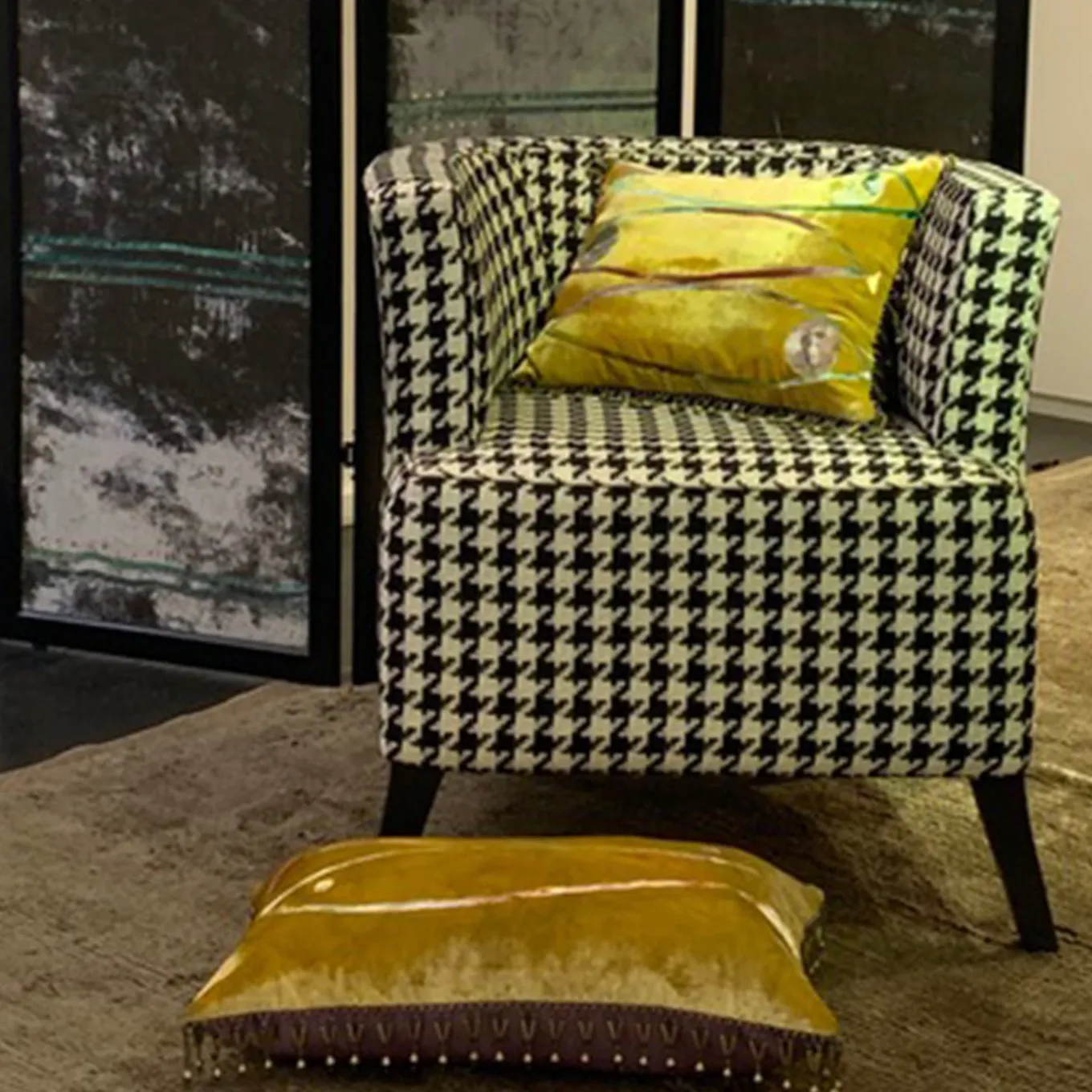 This spectacular cushion features a stunning design of three abstract fish and a trimming in glass beads. Delightfully artistic and beautifully luxurious, the silk velvet Three Fishes Cushion is dyed with yellow, gold and beige colors and hand painted with colored paste and gold leaf details. The back is in elegant purple silk.