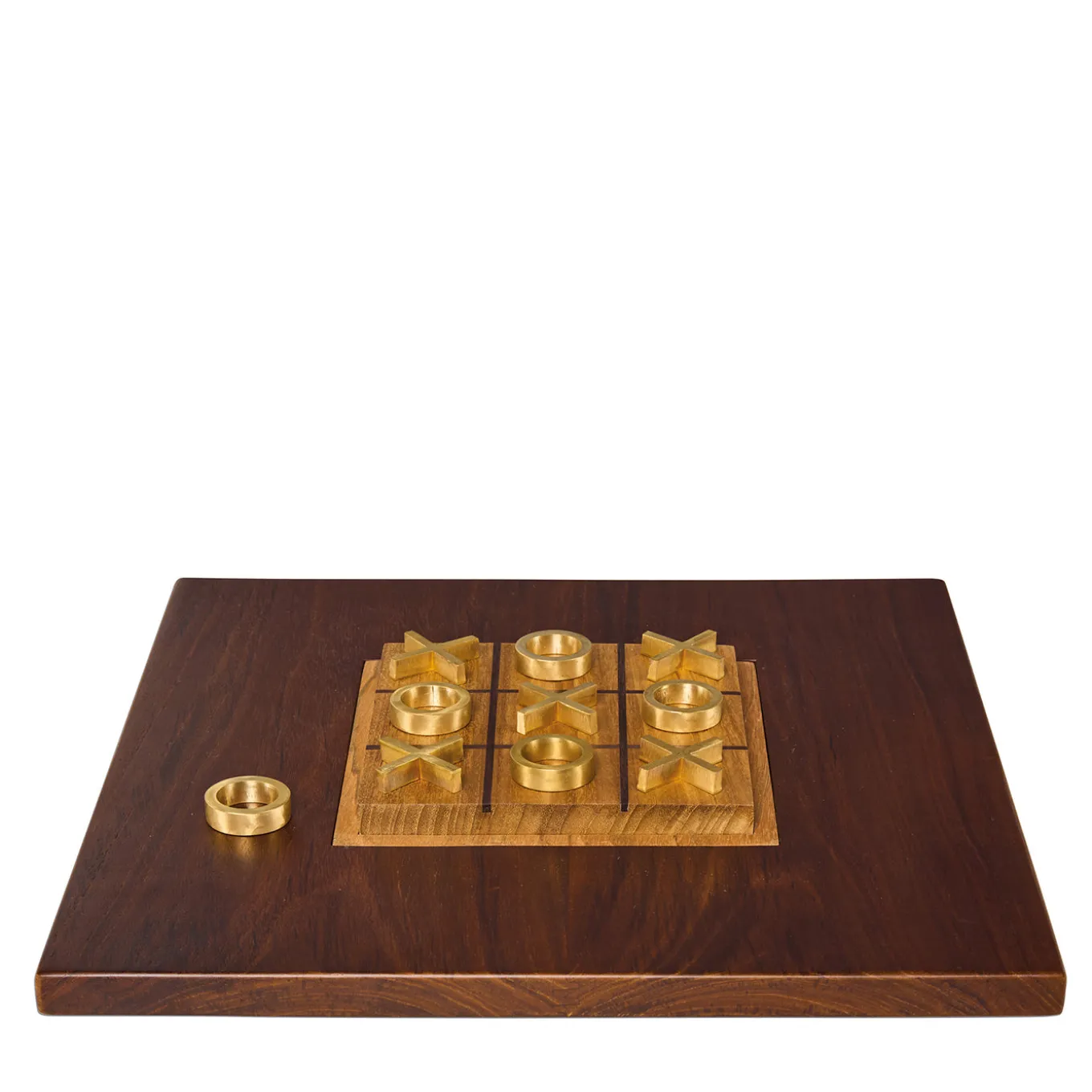 Tic Tac Toe from the Toys collection presents a refined take on the classic game, featuring a teak wood base that showcases its natural grain. The playing grid is subtly integrated into the board, while polished brass pieces offer a striking contrast with their contemporary elegance. This board serves both as an engaging pastime and a sophisticated decorative object, designed for those who value timeless style and thoughtful design in everyday entertainment.