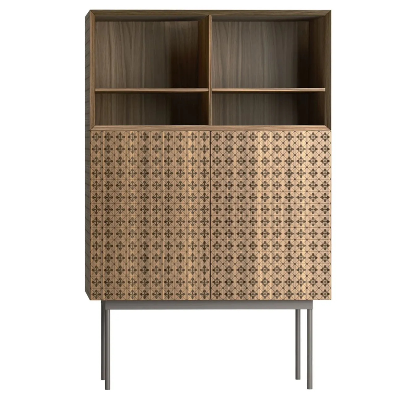 This cabinet is a study in calibrated excellence. Superb for a living or dining area, the sleek geometric silhouette provides optimal storage space while not compromising on style. The top half features four open shelves of varying heights while the bottom features an integrated cabinet to stow away essentials. The cabinet doors feature a repeating diamond-inspired motif with delicate fronds, for a sweet touch. Please contact the Concierge for further details.