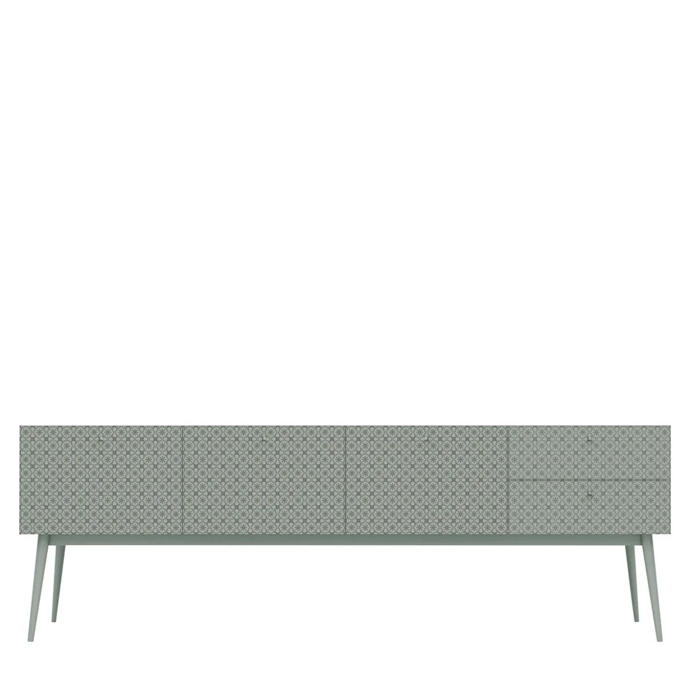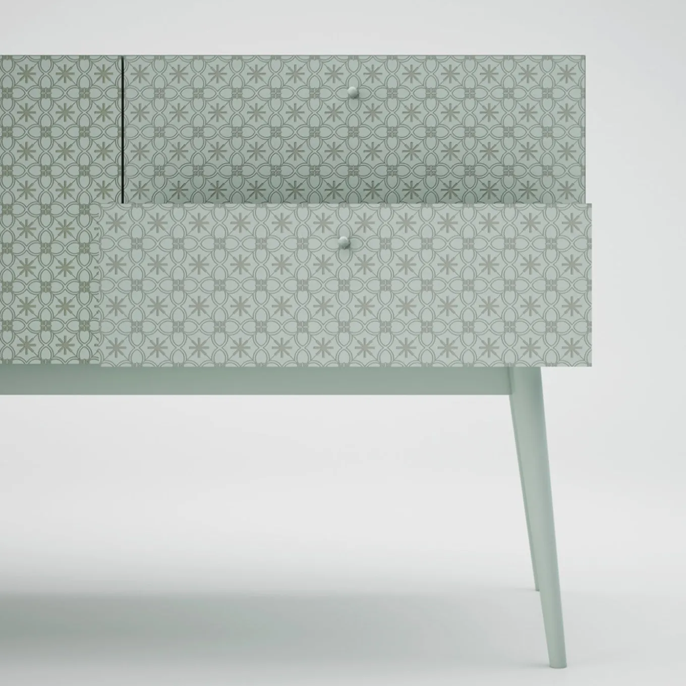 Boasting impressive formal presence, this refined dresser is the stunning focal point of a bedroom or loft space in a contemporary interior. Handcrafted of wood with a matte-white lacquered finish, the clean-lined silhouette is enlivened by a stunning computer-engraved floral pattern inspired by the floor tiles of antique manors. The drawers, tree large (36 cm high) and two small stacked on the right (18 cm high), feature a 15 mm-thick birch plywood interior, Bluemotion slides, and either soft-close or push-pull opening. The steel base is in a matching finish.