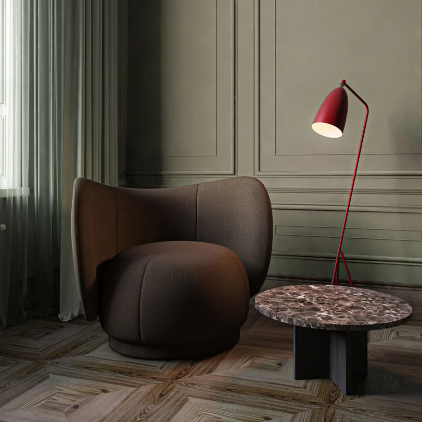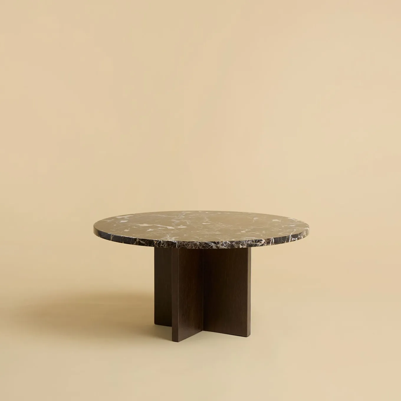 Masterfully crafted with precision, this coffee table from the Tinian Collection harmonizes modern innovation with timeless craftsmanship. It features a round dark Emperador marble top, resting on an oak wood base formed by seamlessly joining, perpendicular slabs. Finished by hand, this piece celebrates the natural flair and historical significance of marble and wood. Please consult the Artemest catalog for alternative versions.