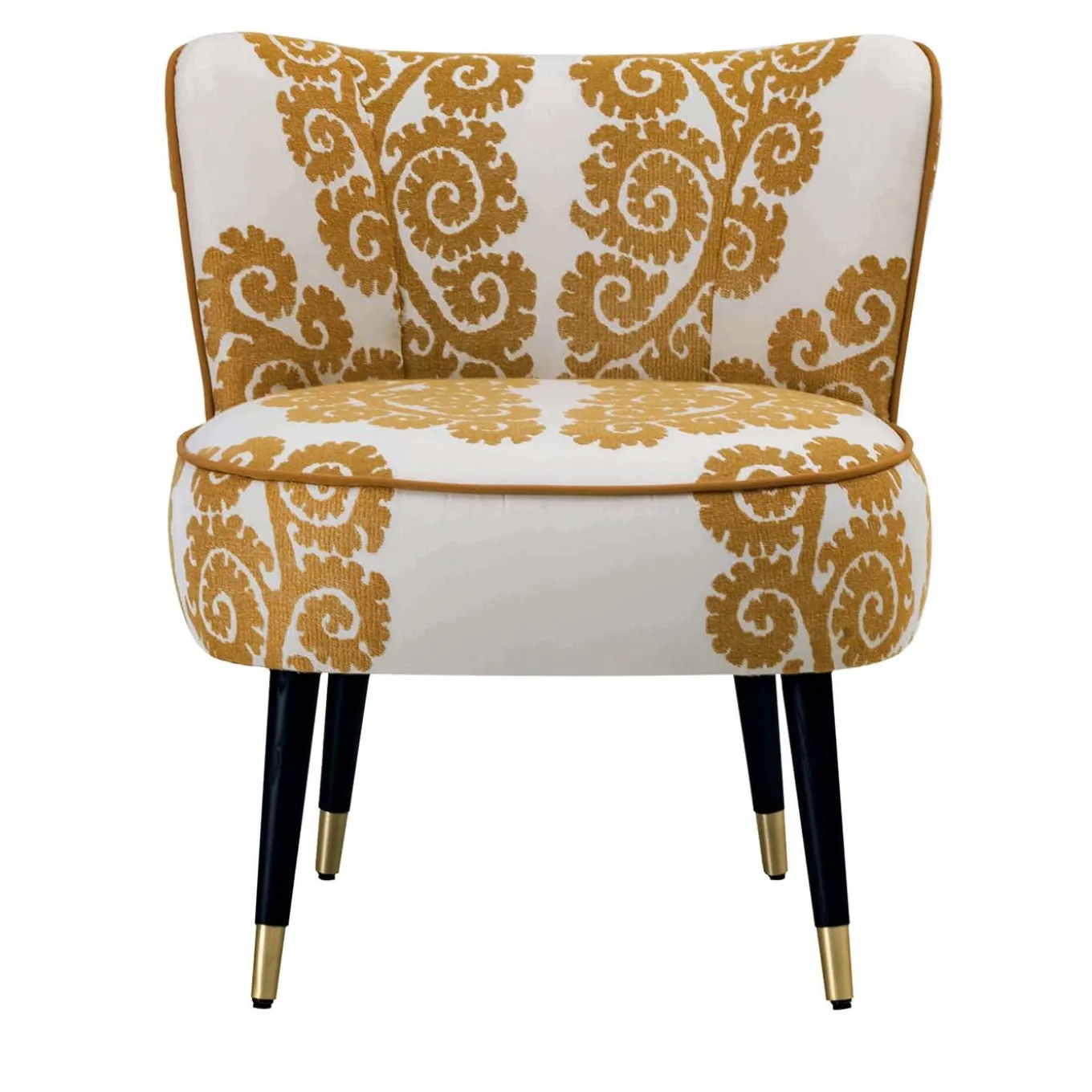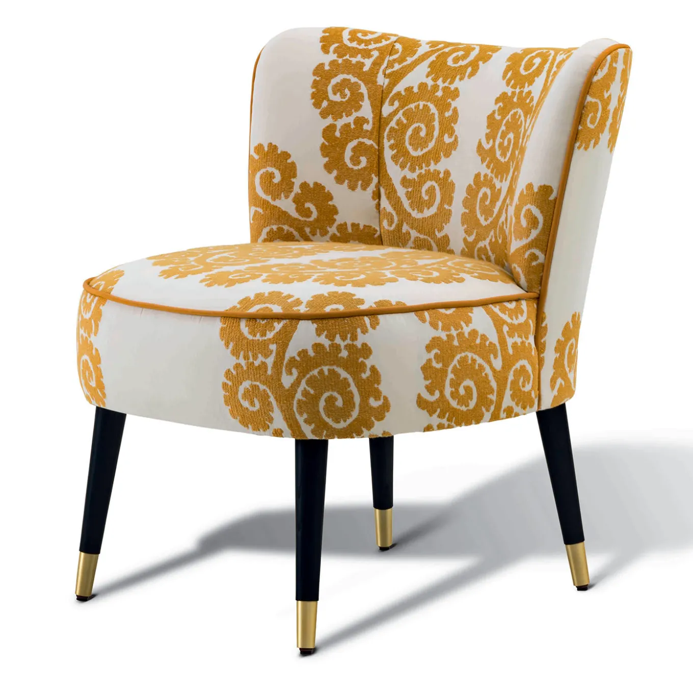 This classy yet original upholstered chair features legs in dark walnut with brass or bronze painted metal tips. The seat and the backrest are made of wood and are upholstered with high-strength, variable-density foam with polyurethane insert. The cover cannot be removed.