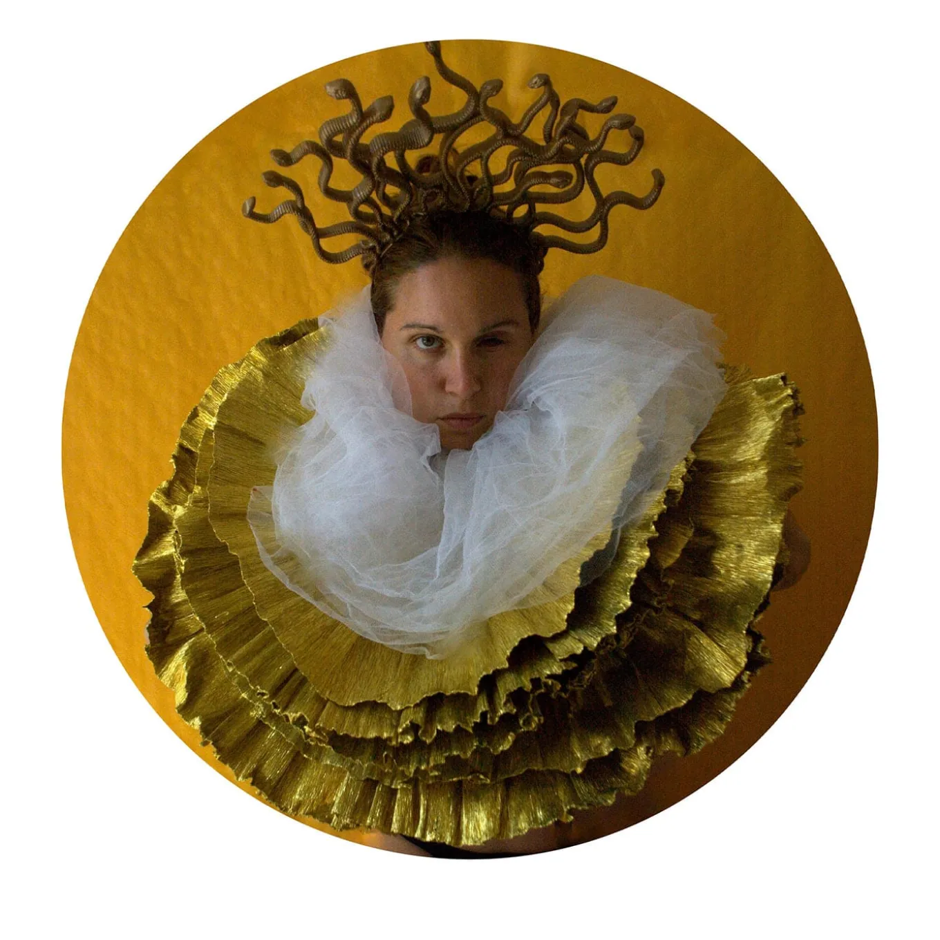 A sophisticated artwork by Ilaria Facci, this self-portrait was made in 2020 as part of an exclusive series. Interpreting the myth of Proserpina, it is distinguished by an unconventional round frame and a shimmering palette of gold shades. Available in three copies, it is printed on fine art photographic paper. It can be customized in other dimensions upon request.