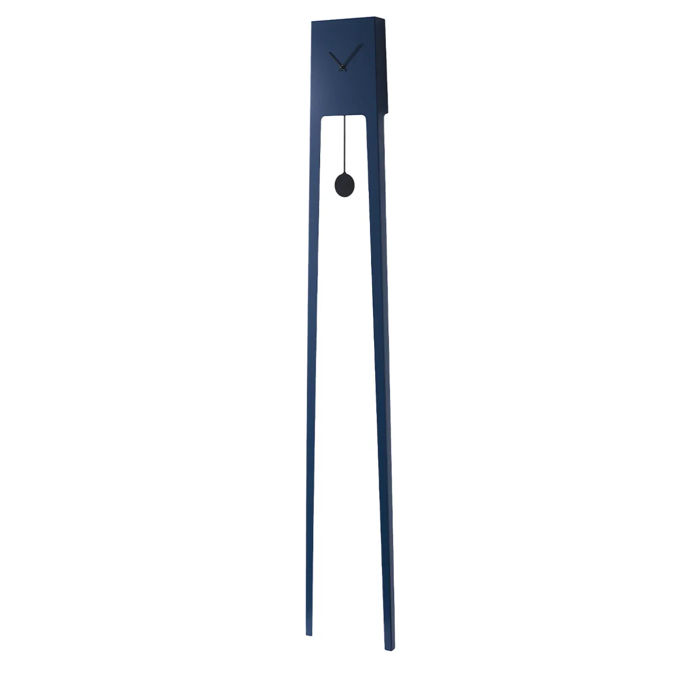 A pendulum clock with a sleek, elongated form made from painted steel in blue. the design features an open frame where the pendulum swings visibly, creating a minimalist and contemporary aesthetic. The clock face is simple, with minimal markings and slender hands. This model combines functionality with a sculptural presence suitable for modern interiors. Available in other color options. Please contact the Concierge for further information. Design by Ari Kanerva.