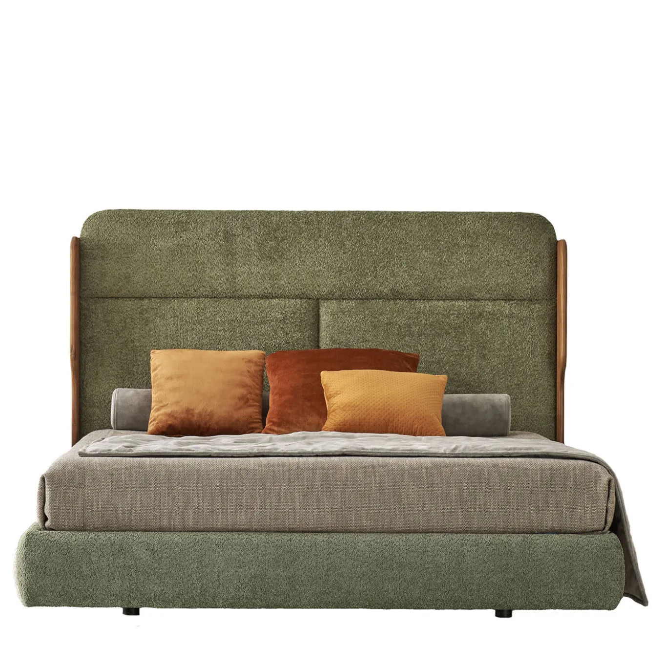 A testament to effortless beauty, the Tobia Bed features a solid Canaletto walnut frame treated with an eco-friendly oil finish. The Olive Bouclé upholstery of the headboard adds a rich, earthy texture, creating an inviting atmosphere. Designed for functionality as well as design, the bed includes a sturdy wooden slatted base measuring 195x205cm. Perfectly proportioned, this piece will infuse warmth and elegance to restful spaces.